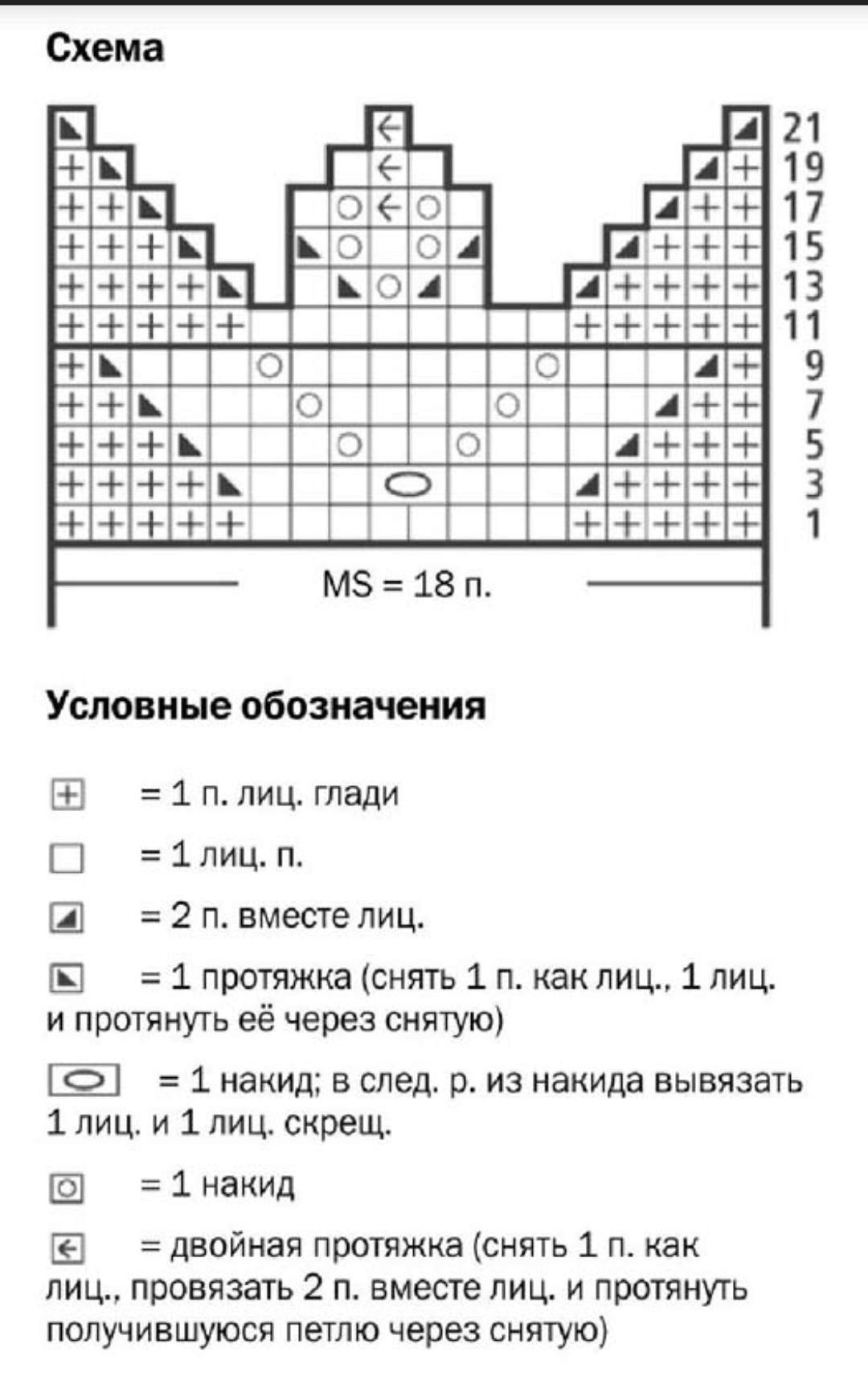 Основной узор, спицы № 3,5: вязать круг. р. по схеме, на которой приведены только нечётные р. В чётных р. все петли и накиды вязать лиц., если нет других указаний. Повторять с 1-го по 10-й р., для убавлений вязать с 11-го по 21-й р.
