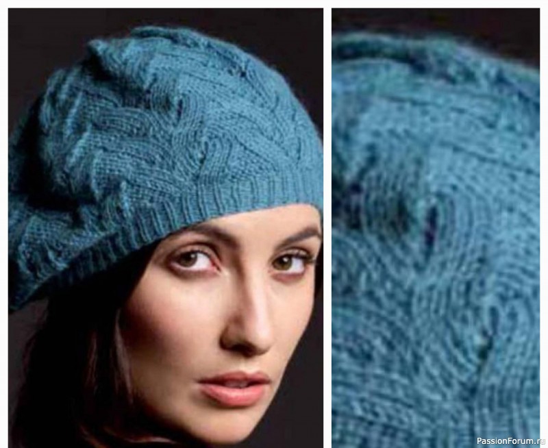 Вязание женской шапки спицами — выполнение работы: на круговые спицы № 2,5 набрать 120 п. и связать 2,5 см резинкой. В последнем ряду после каждой 2-й п. вывязать 1 лиц. п. скрещ. из поперечной нити = 180 п. Далее вязать основным узором круговыми спицами № 3,5. Через 17,5 см (= 50 р. основного узора) связать с 11-го по 21-й р. основного узора, перейдя по необходимости на чулочные спицы = 30 п. В след.