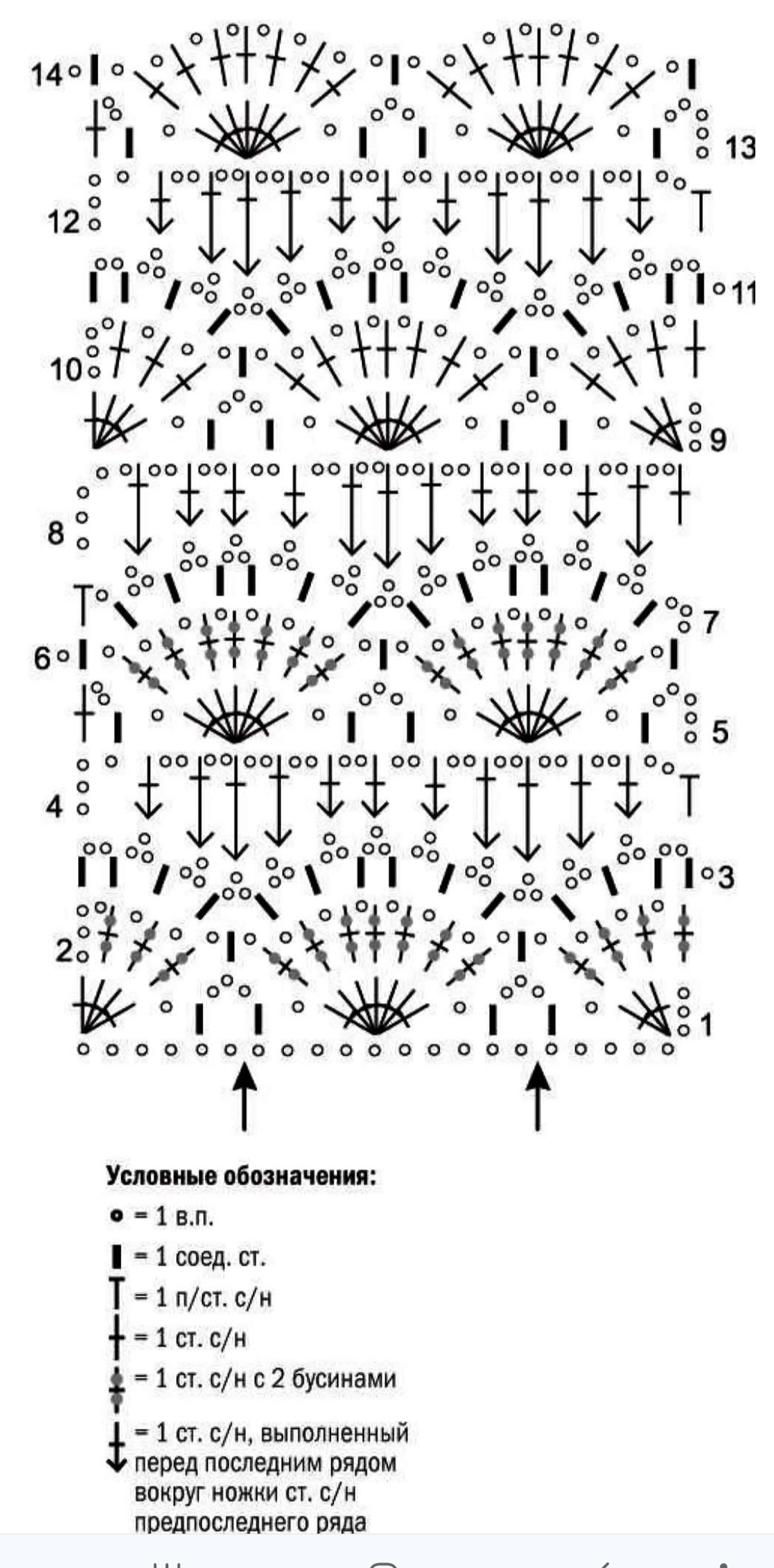 Узор для крючка: вязать по приведенной схеме. Начать с петель перед правой стрелкой, повторять раппорт из 10 п. между стрелками и закончить петлями после левой стрелки. В высоту 1 раз выполнить с 1-го по 14-й р., затем повторять с 7-го по 14-й р. Если значки на схеме соединяются внизу, то столбики вяжут в одну и ту же петлю основания. Бусины нанизать на нить перед началом работы во 2-м и 6-м р., на каждый раппорт по 14 бусин + 12 бусин для петель начала и конца ряда. Четные ряды — лицевые ряды, нечетные ряды = изнаночные ряды.