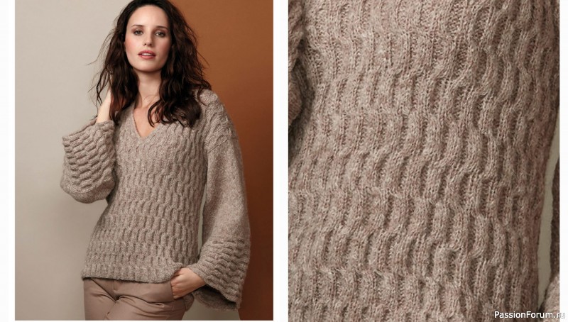 Нижняя часть рукавов этого пуловера связана в поперечном направлении, а затем по длинной стороне этих своеобразных манжет набирают петли для основной части рукава.
