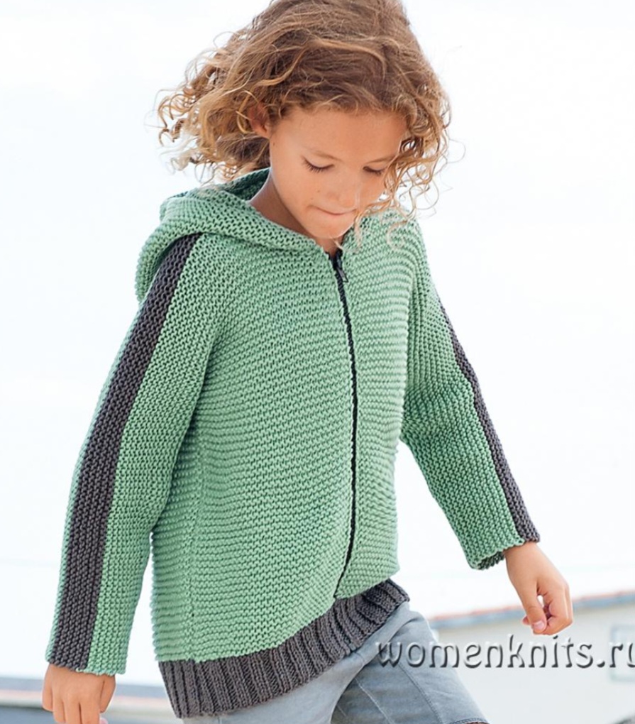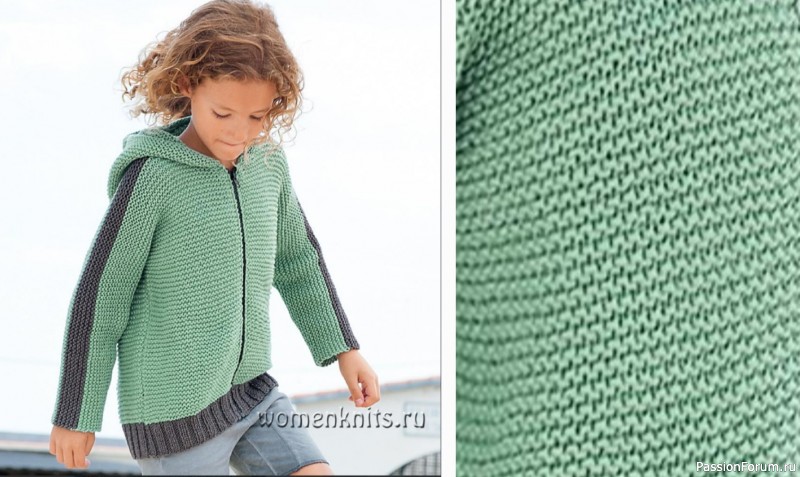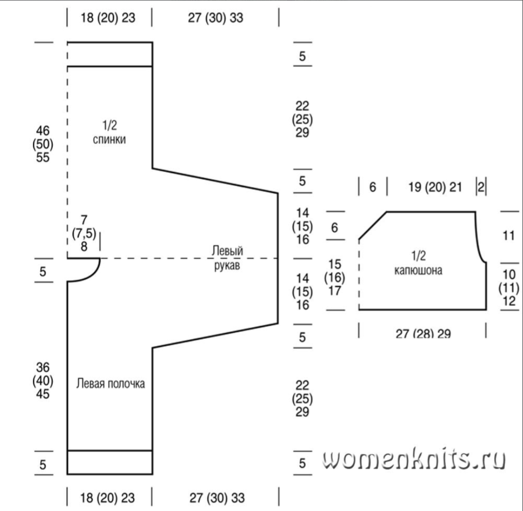 Каждая полочка и половина спинки этого жакета с капюшоном связаны единым полотном, а затем на спинке сделан шов, а впереди вшита молния.