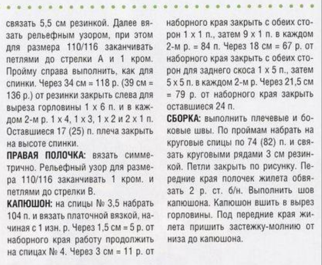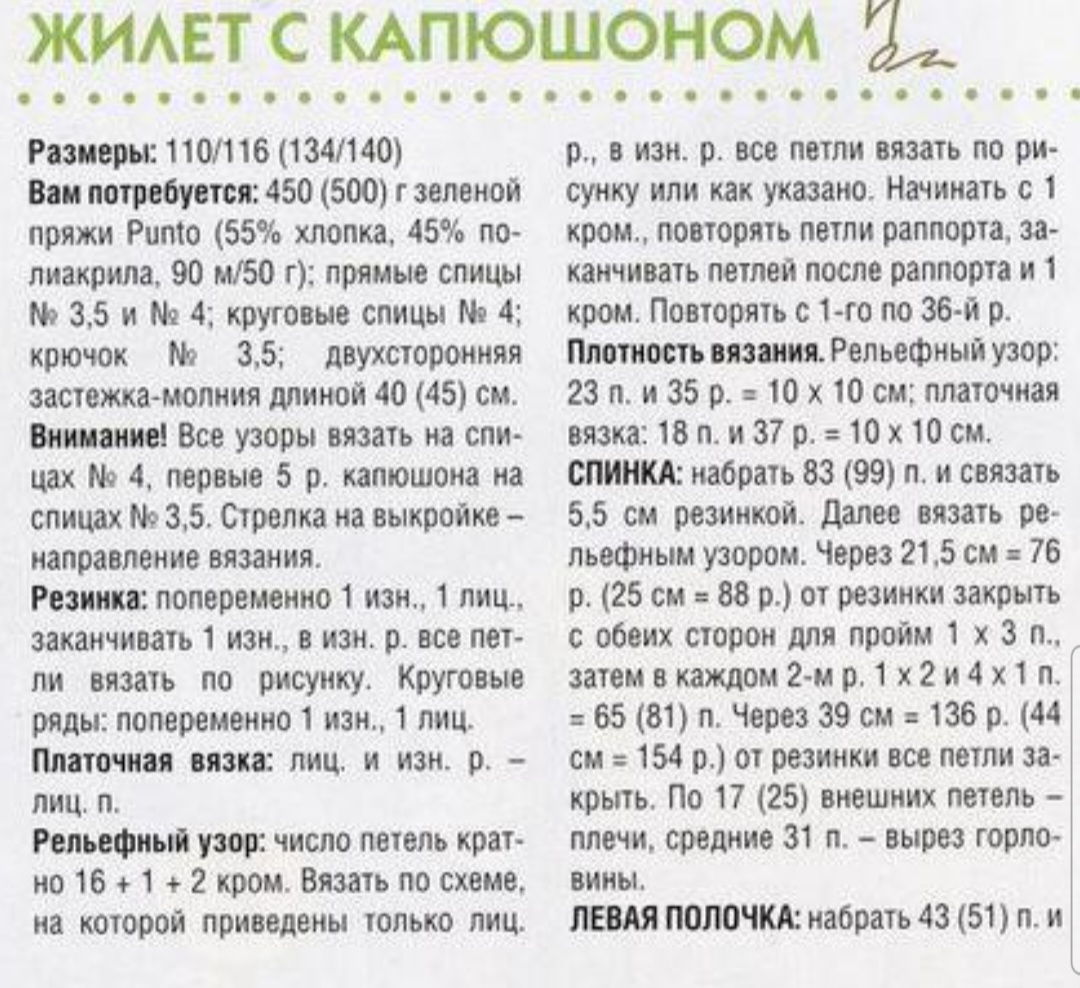 Размеры: 110/115(134/140) Вам потребуется: 450 (500) г зеленой пряжи Punto (55% хлопка. 45% полиакрила. 90 м/50 г): прямые спицы № 3,5 и № 4: круговые спицы № 4: крючок № 3.5; двухсторонняя застежка-молния длиной 40 (45) см