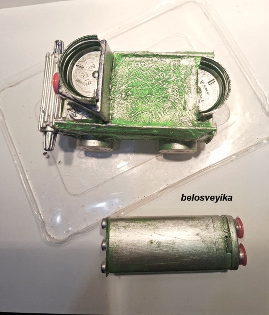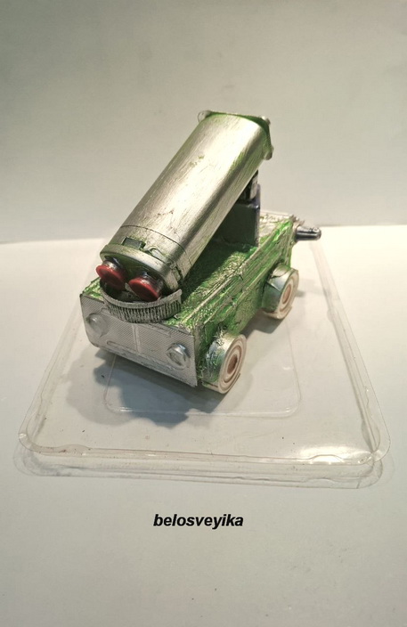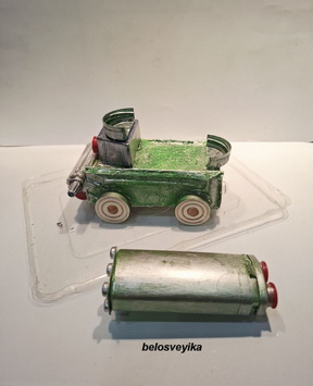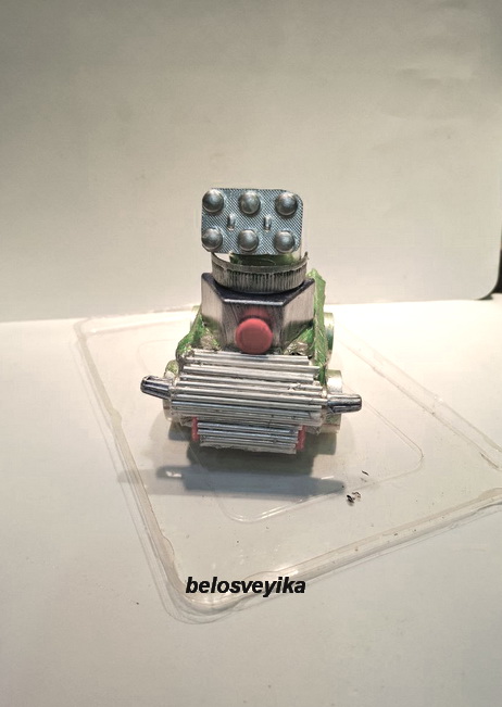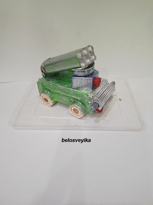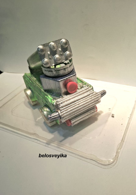 Машина типа Катюша. Изготовлена из упаковки от лекарства.Свехжу детали конструктора.Спереди пустые втулки т н ток, обклеены палочками от ушных ватных палочек.Верх это коробочка от конфеток, спереди коробочки приклеен блистер с таблетками, сзади вырезала сердцевину от красной крышки.Колеса это шашки.Задние фары это блистер от таблеток,.Все обклеено салфетками, покрашено зеленой каской, затонировано серебряной.