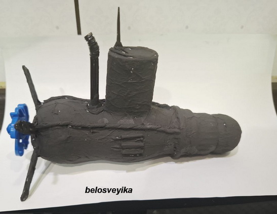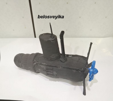 Подводная лодка.Выполнена из пластиковой бутылочки от йогурта питьевого.Сверху приклеена крышка полукруглая, перескоп это соломинка для коктейлей, лесенки из зубочисток, нос из пробок. Винты из палочек от блистера таблеточного и в центре готовая синяя деталь от игрушки в виде винта.Все обклеено салфетками, покрашено черным акрилом, затонировано серебряной краской.