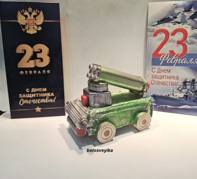 Поделки выполнены в виде военной техники.Подводная лодка и машина типа Катюша.