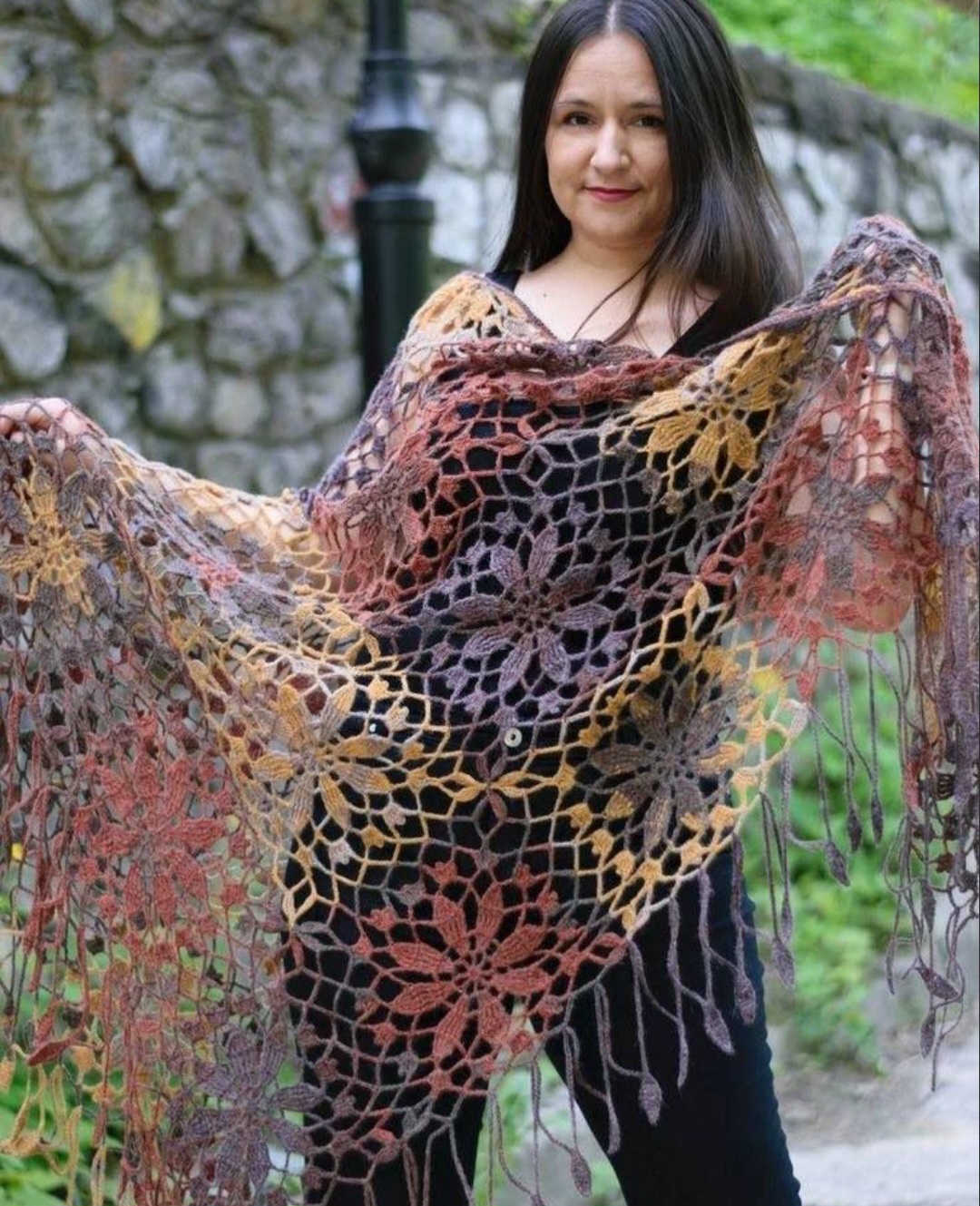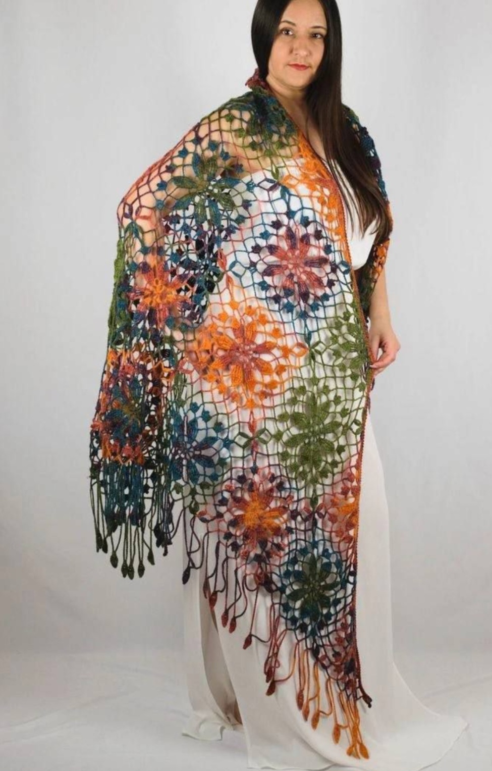 Это великолепное пончо крючком с узором из ярких цветочных мотивов — настоящее произведение искусства. Дорогая, вы просто находка для моды! Уникальные детали, такие как переходы оттенков из зелёного, оранжевого и синего, создают эффект радости и тепла. Каждый мотив связан с любовью и аккуратностью, а кисточки на краях добавляют текстурной изысканности. Это идеальное дополнение к вашему гардеробу, которое подчеркнёт вашу индивидуальность.