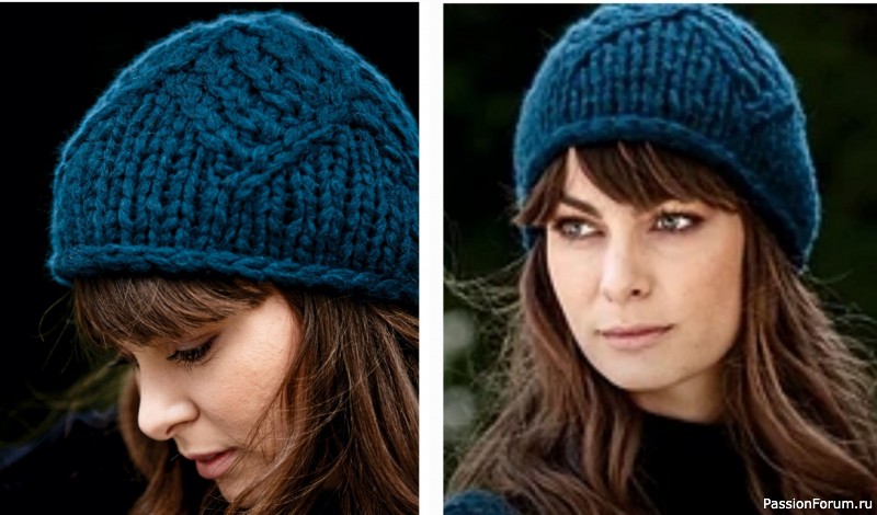 Шапка с интересным узором, связанная на толстых спицах, выполняется очень быстро и довольно просто.