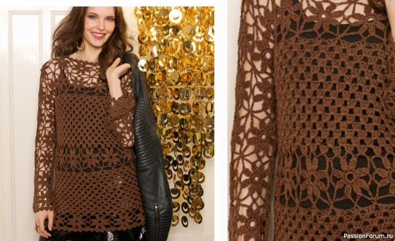 Красивый пуловер с кокеткой и прошвами из квадратных мотивов выглядит очень нарядно.