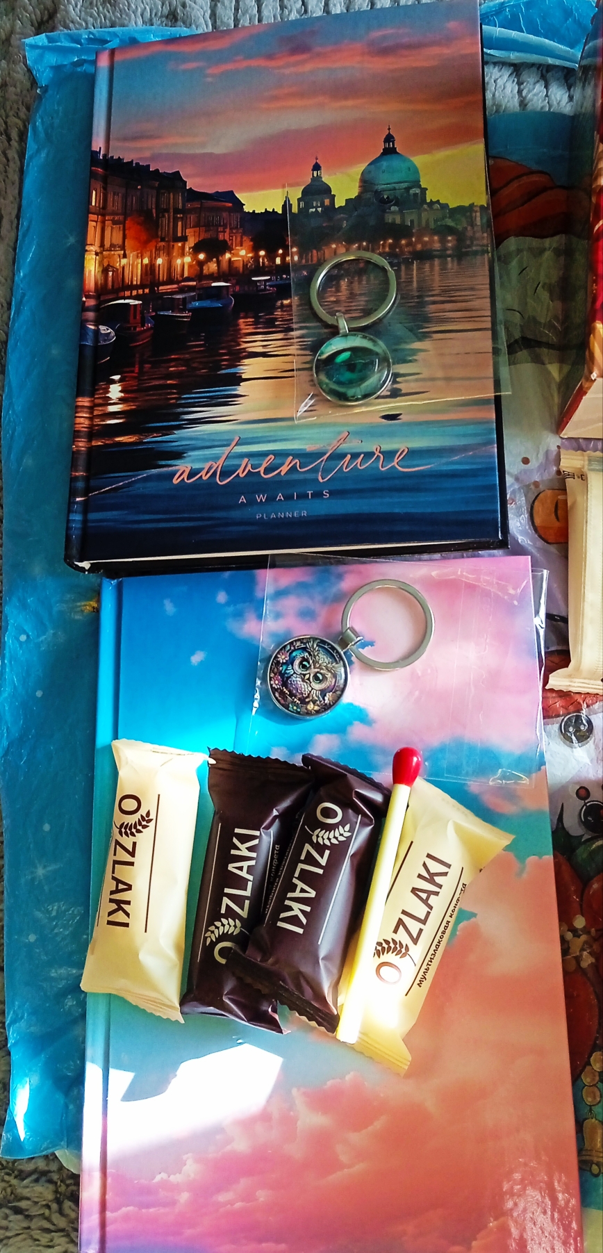 Два пакета- подарки для внучек: красивые ежедневники, брелоки, сладости и загадочные "спички"(честно, я даже лизнула красную часть).