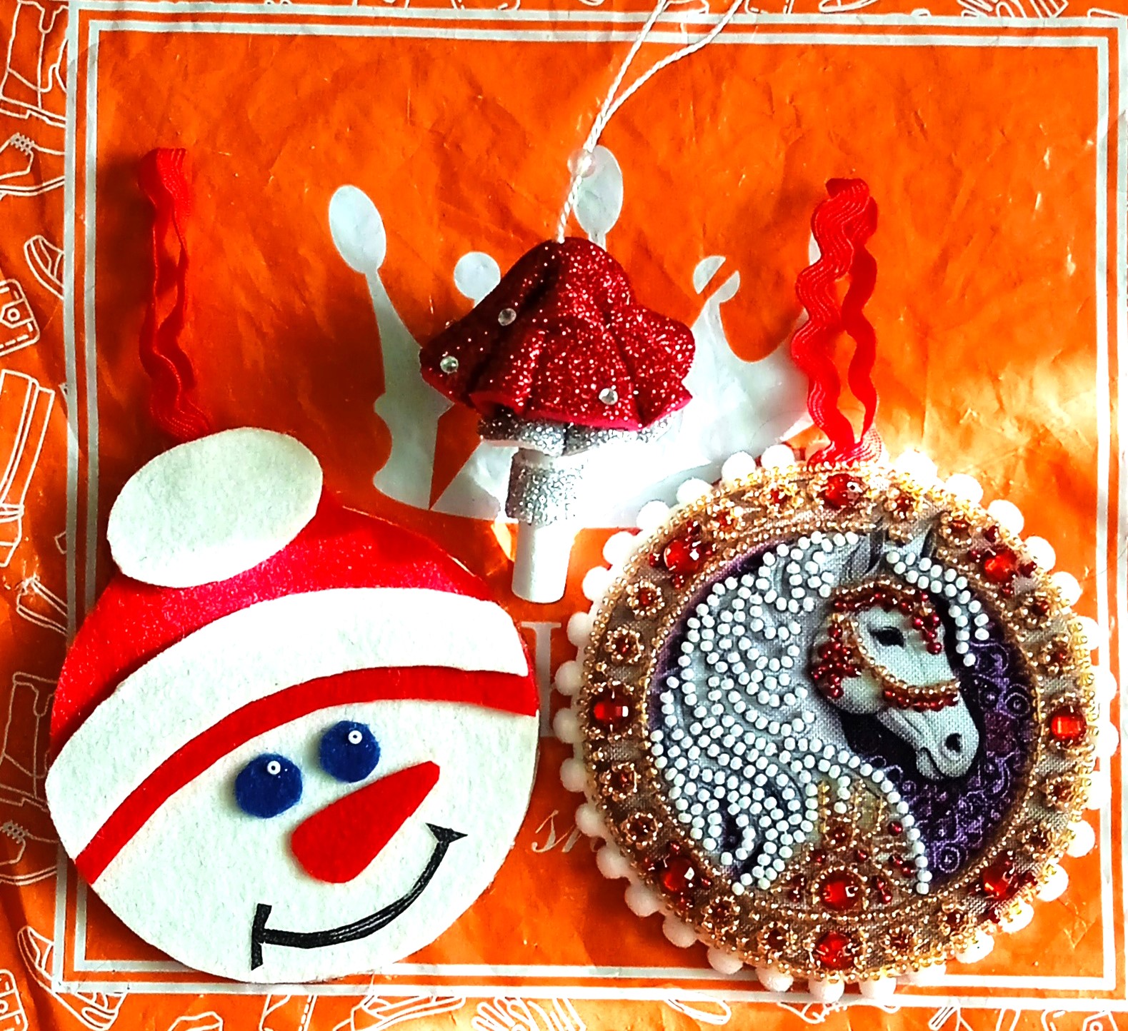 Полюбуйтесь рукодельными сюрпризами от Людмилы! Игрушки на ёлку: милый грибок из фоамирана, развесёлый Снеговик, красивейший подвес, вышитый бисером - Лошадка! Спасибо за теплоту души! За такие великолепнейшие подарки!