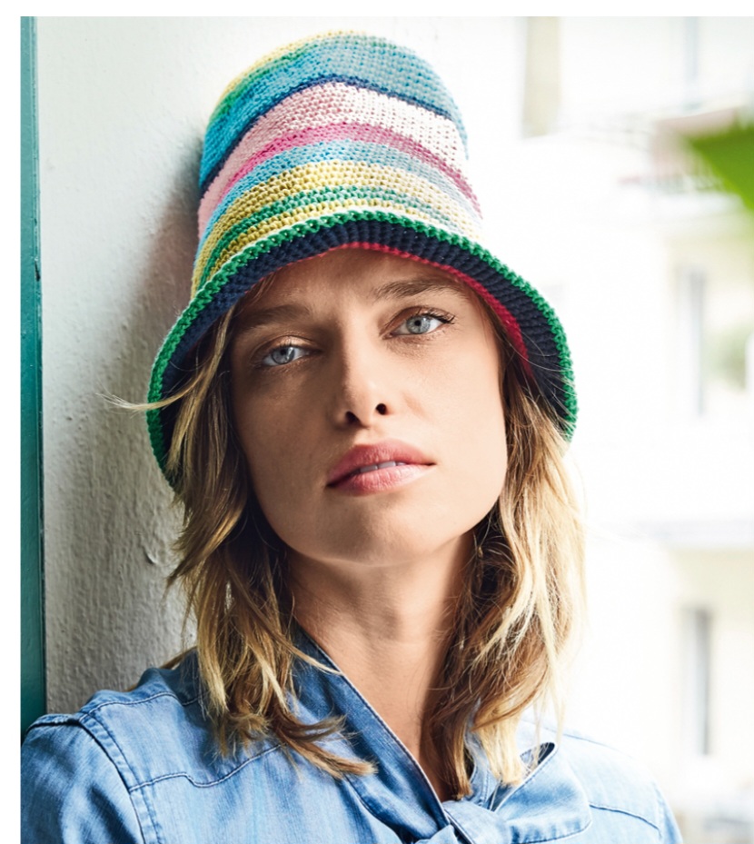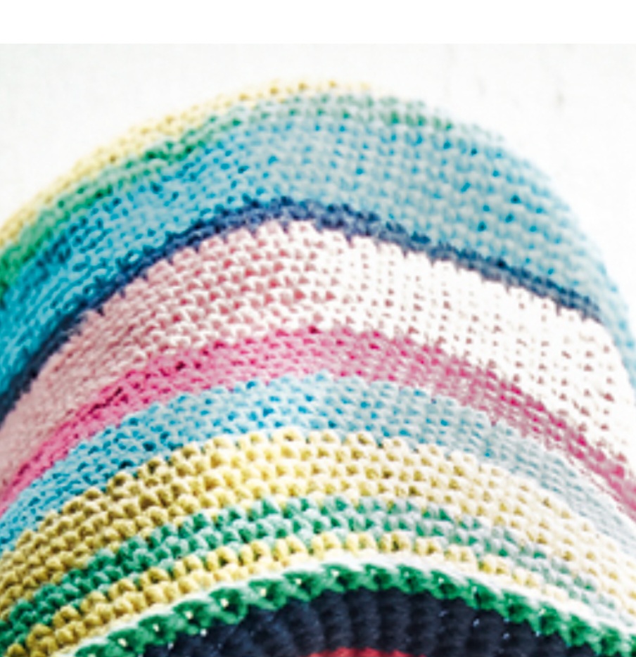 Вязаная шляпа а-ля рыбацкая панама в круговую разноцветную полоску защитит от холодного ветра и яркого солнца.