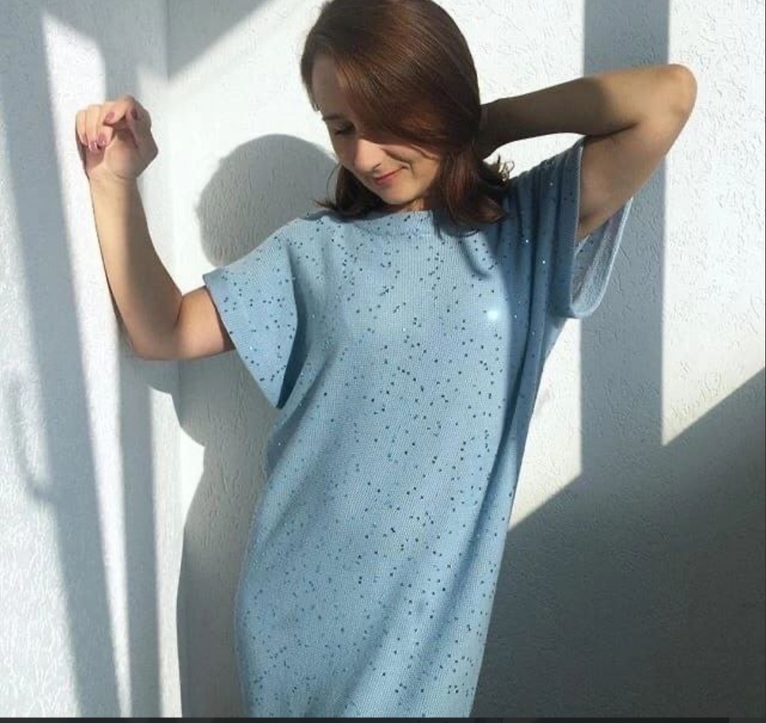 Легкое и воздушное платье-кокон выполнено из мягкой пряжи с аккуратным узором и украшено мелкими блестящими пайетками, которые придают изделию изысканный блеск и особую изюминку. Свободный крой обеспечивает комфорт и свободу движений, а короткие рукава добавляют современный стиль. Идеально подходит для теплого сезона и создаёт эффект легкости и элегантности.