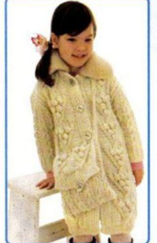 Вам потребуется: 650 г для пальто и 200 г для сумочки кремовой пряжи Mondial Pnma (100% мериносовой шерсти. 95 м/50 г): прямые спицы № 5,5 и № 6; вспом. спица № 6: крючок № 4; 5 +1 пуговица; штопальная игла.
