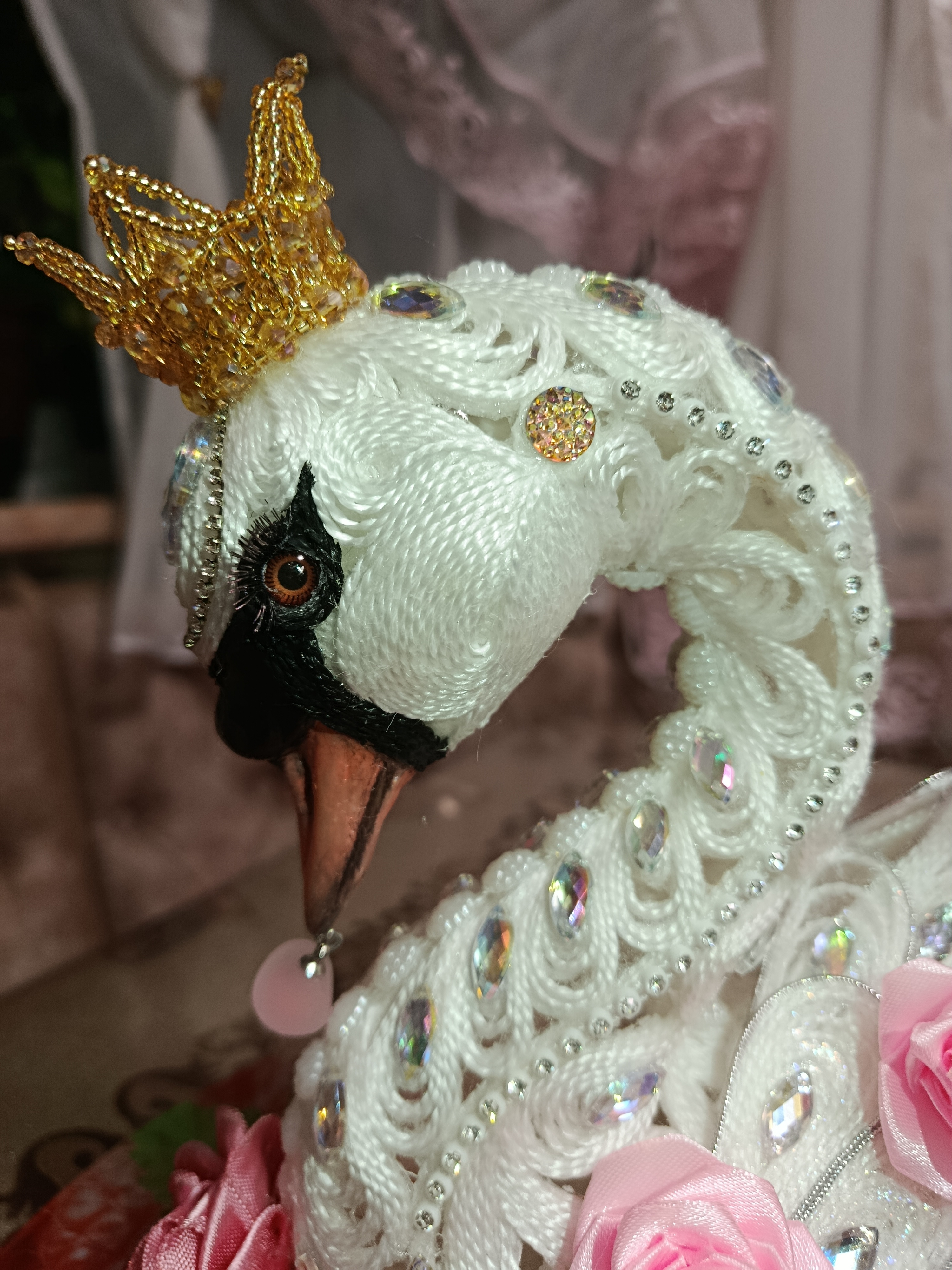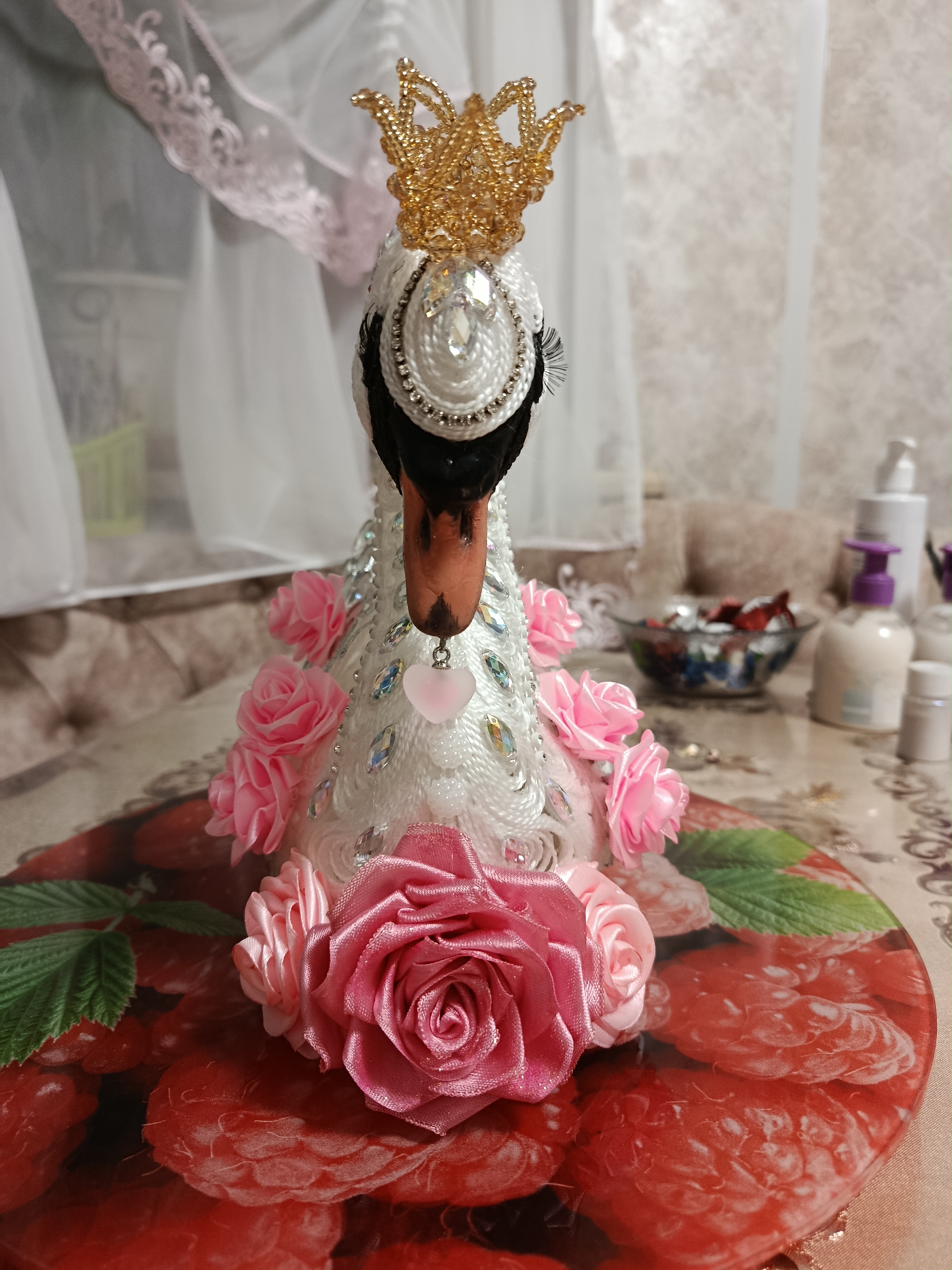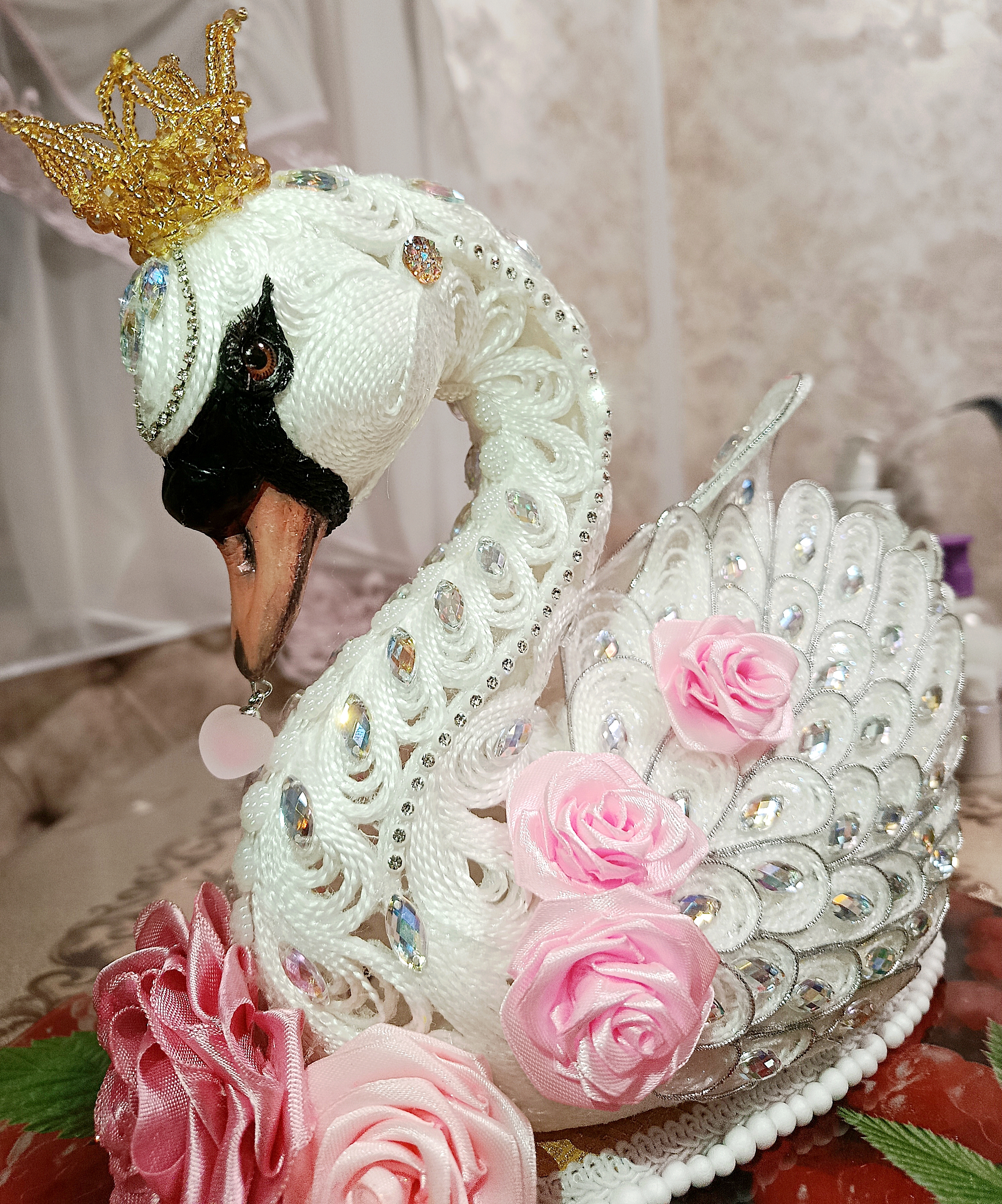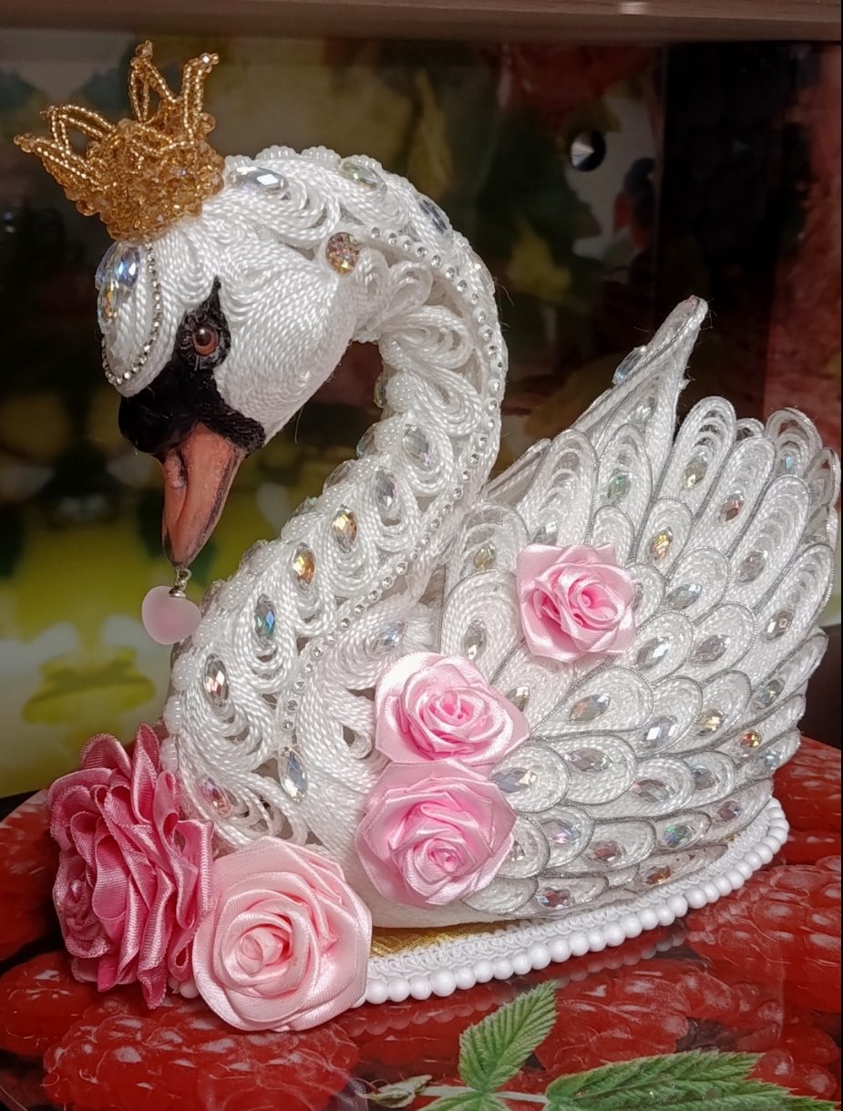 Лебёдушка рождалась долго. Много придумывалось сразу, а что-то приходилось обдумывать и днями. Самыми сложными в ее изготовлении стали клюв и корона. Проще всего было бы сделать в той же технике, но было бы не то. Очень старалась максимально приблизиться к оригиналу. Для меня было это ну очень непросто: рисовать я не умею от слова совсем. Эти задачи решились с помощью смешения техник. Такая практика мне понравилась. Буду использовать ее и дальше.