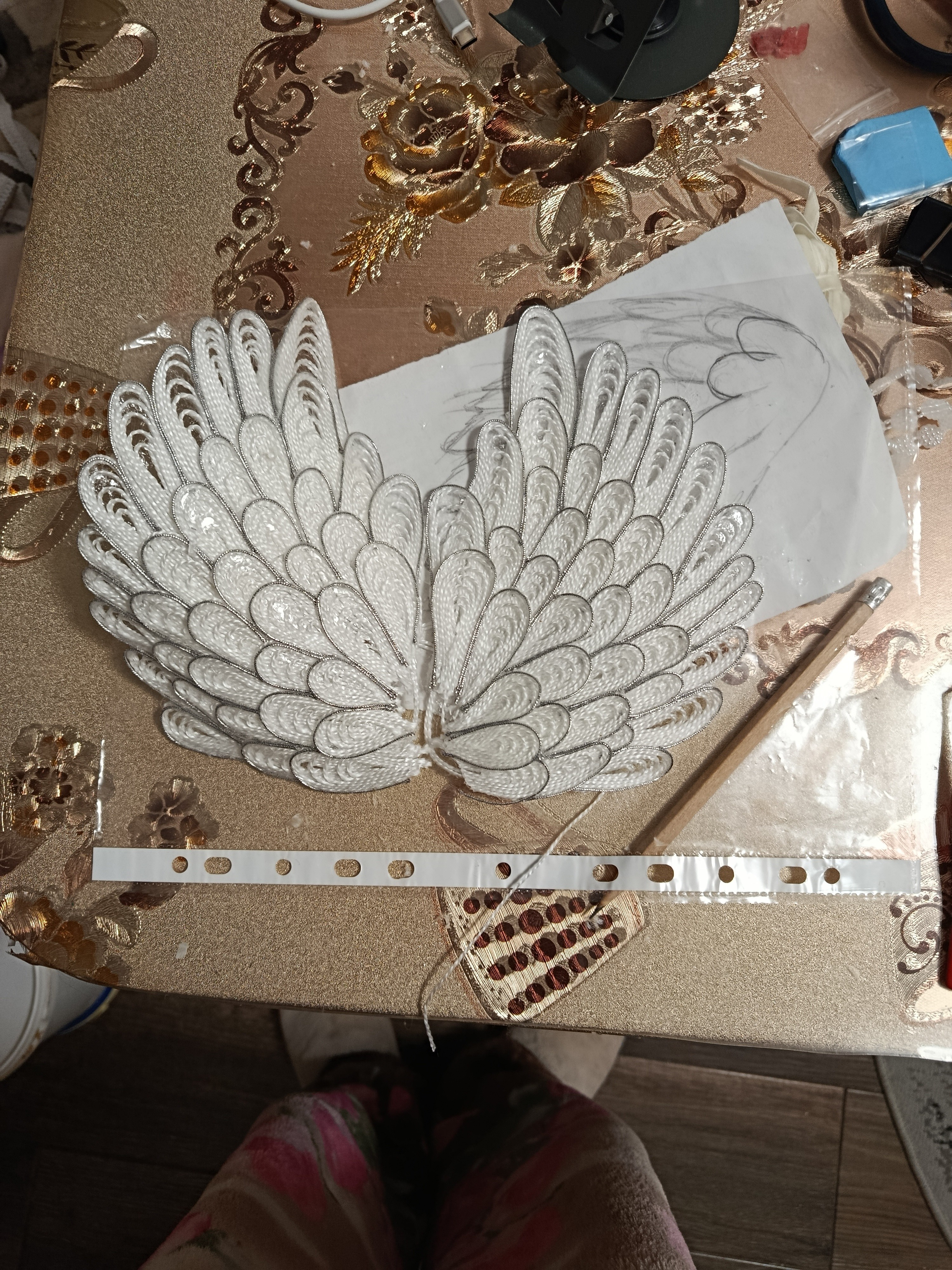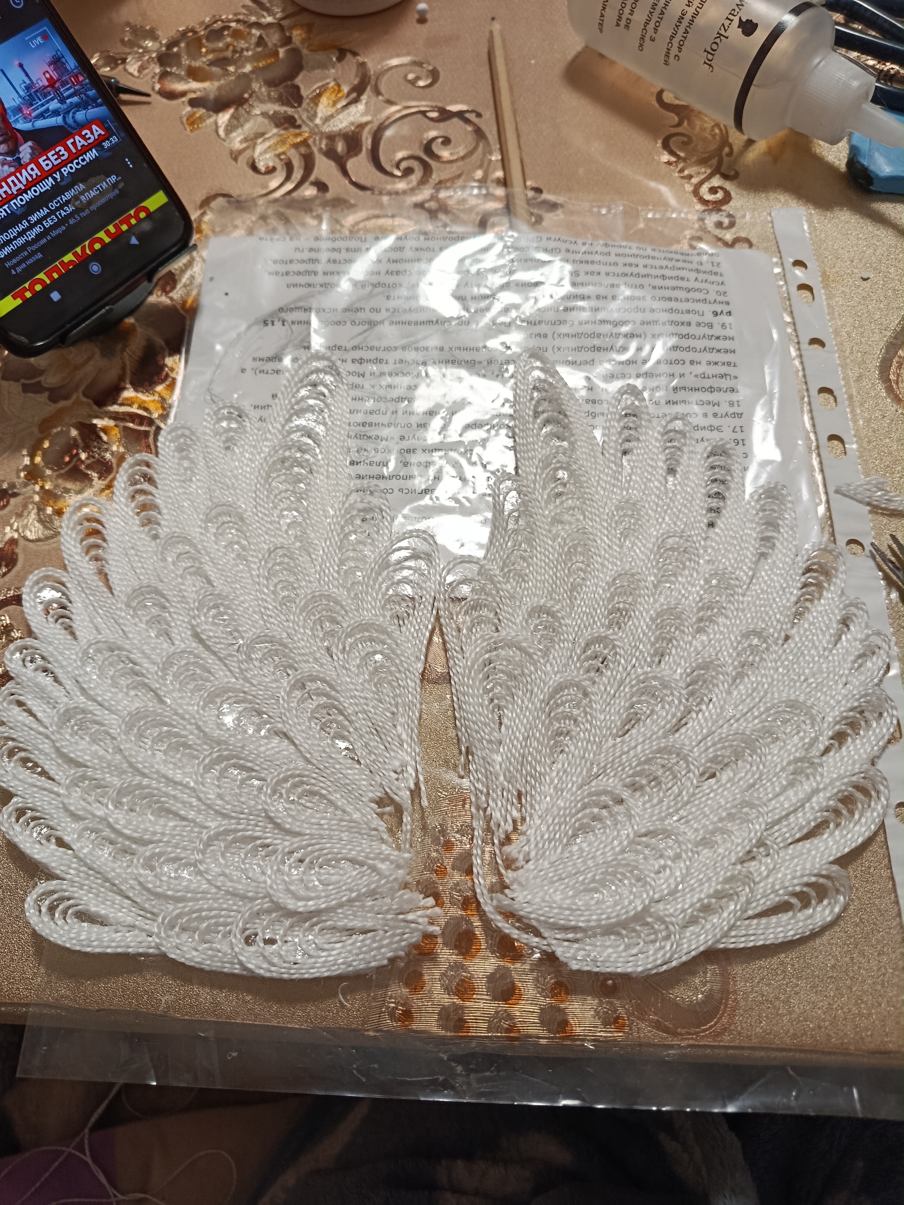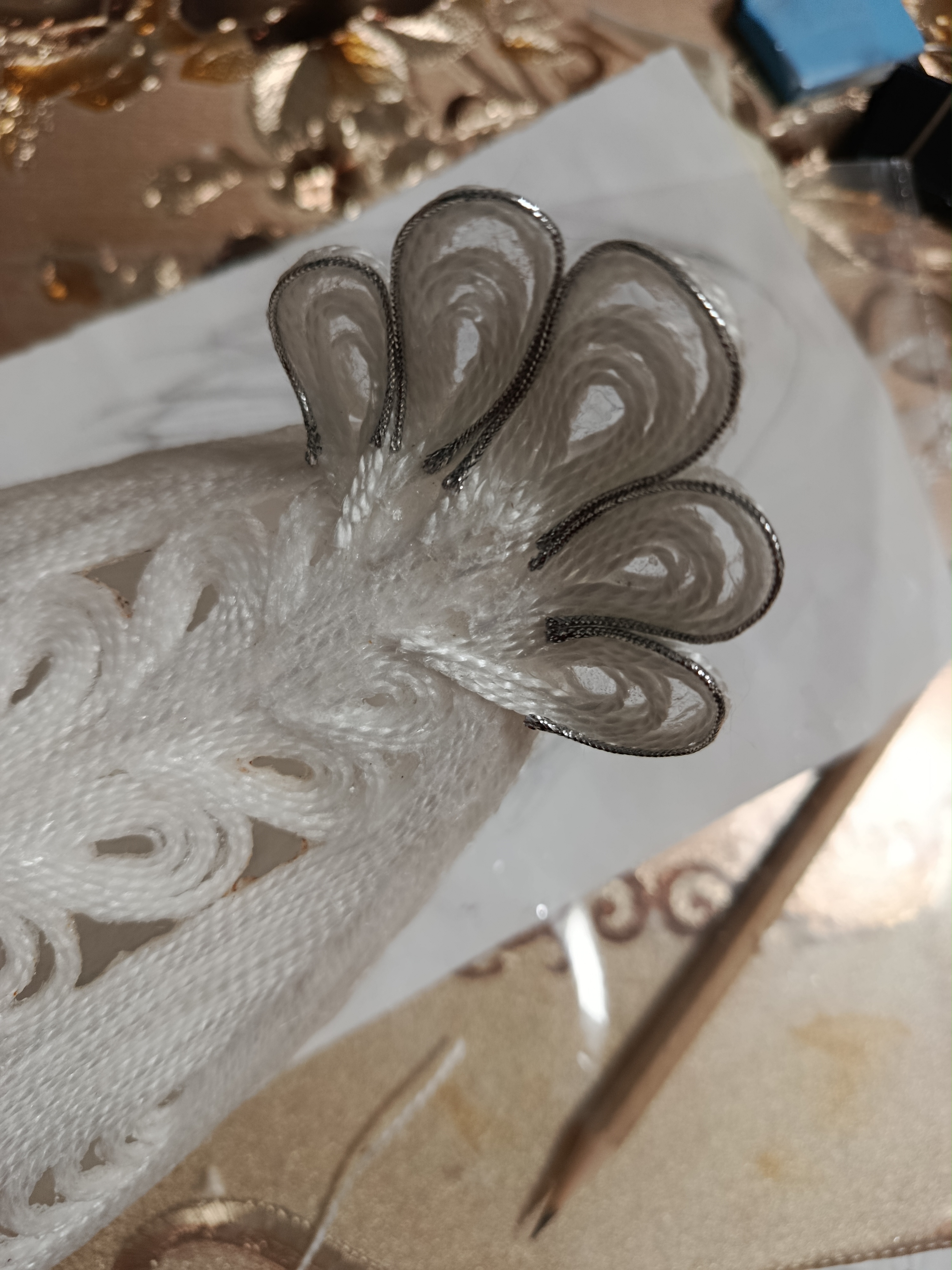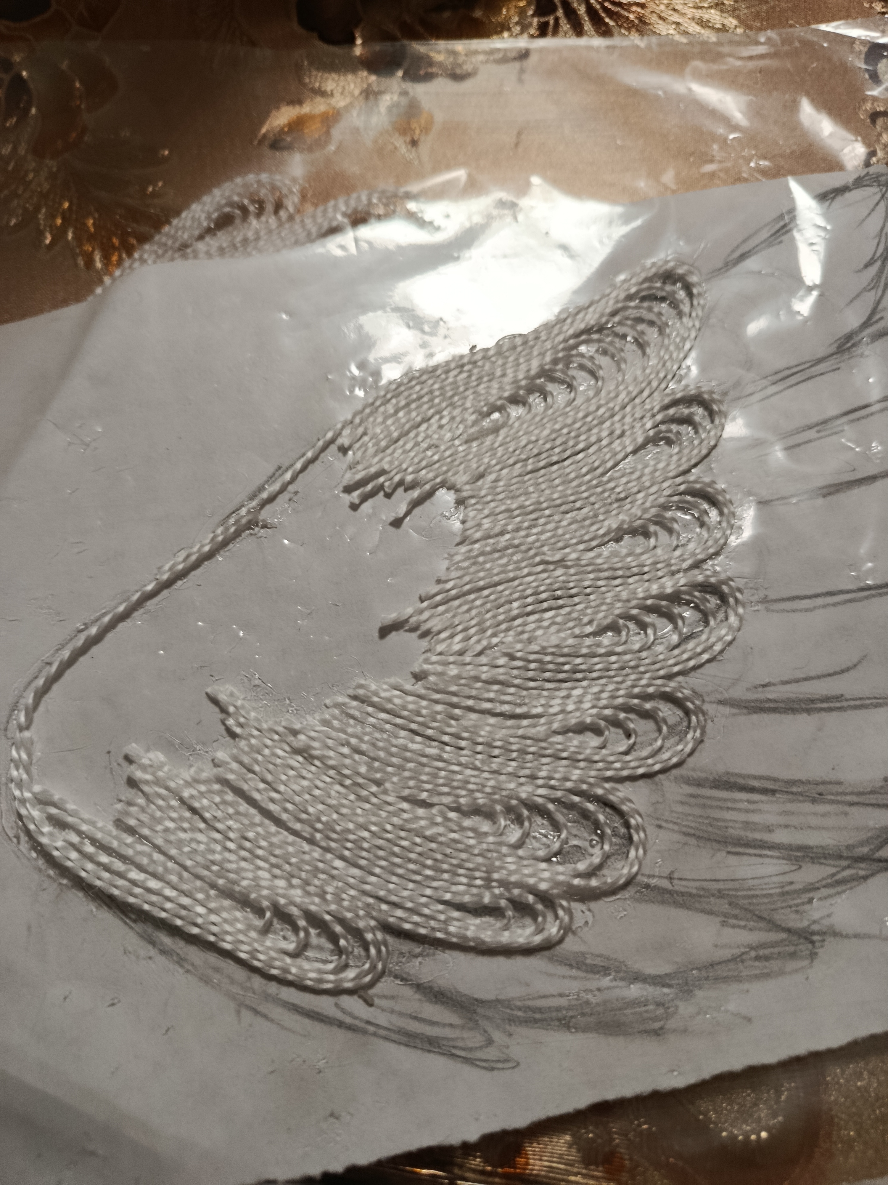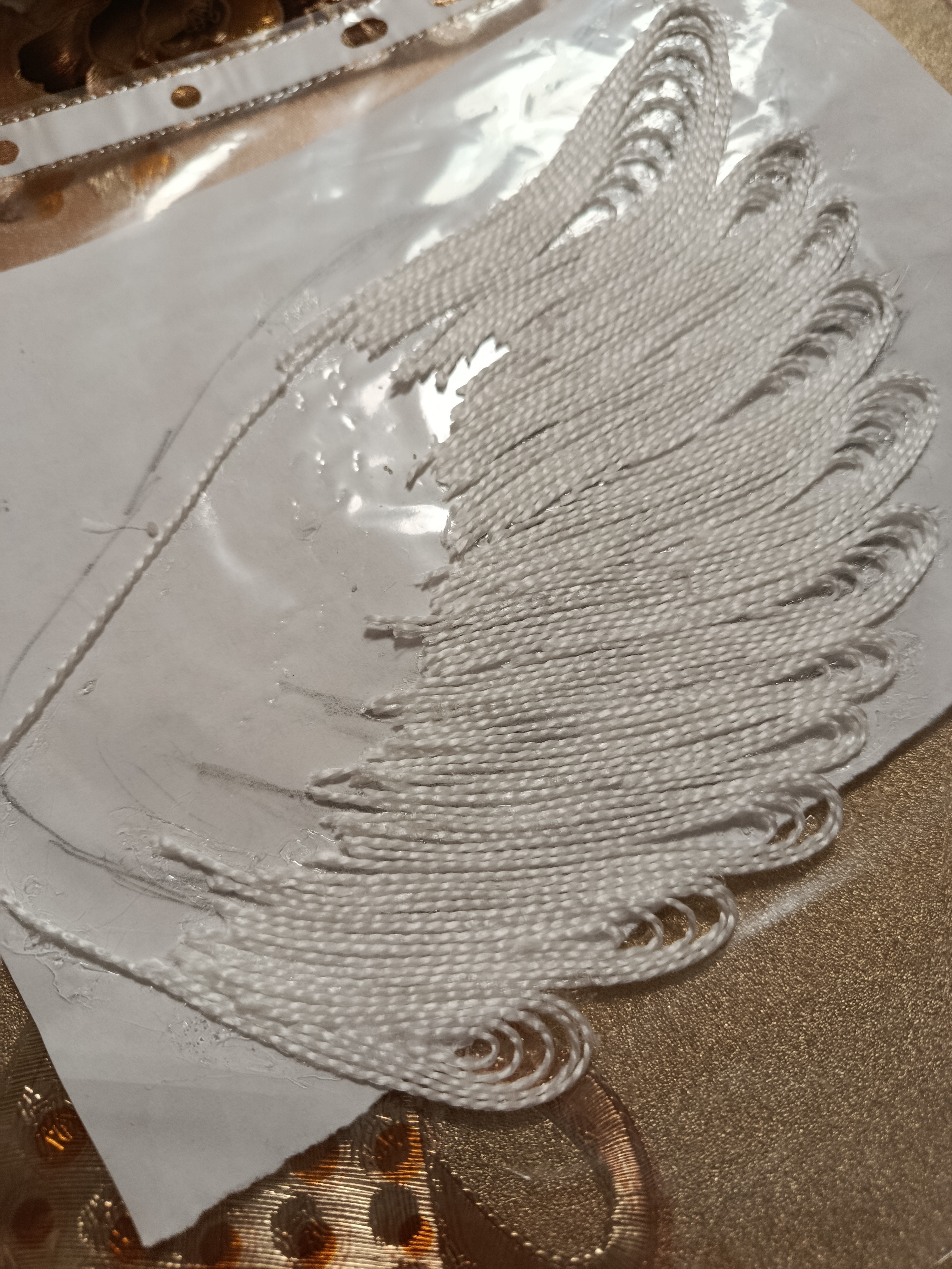 Серебряным шнуром выкладываем контур. Иначе наши крылышки будут сливаться и выглядеть "слепыми".