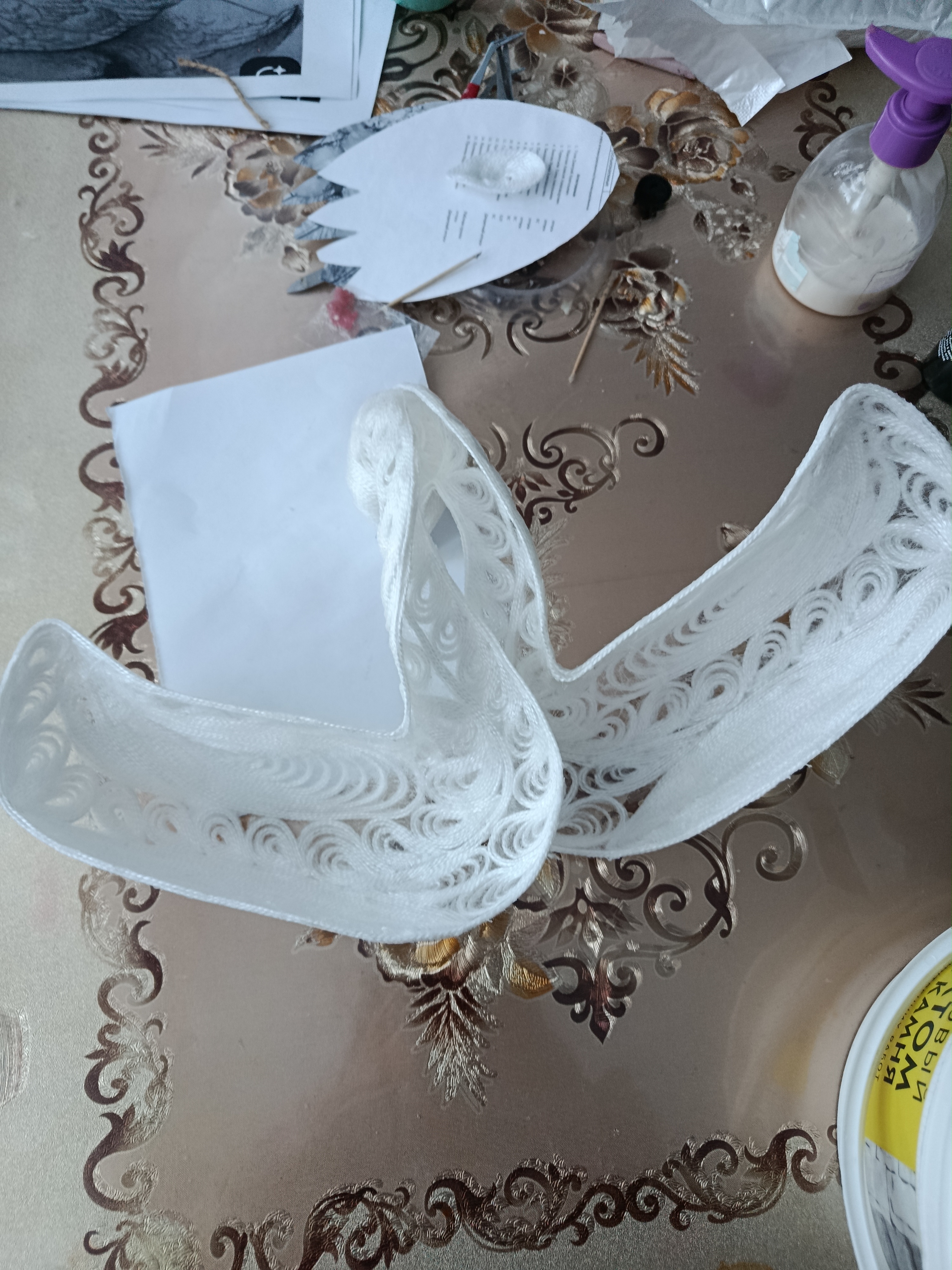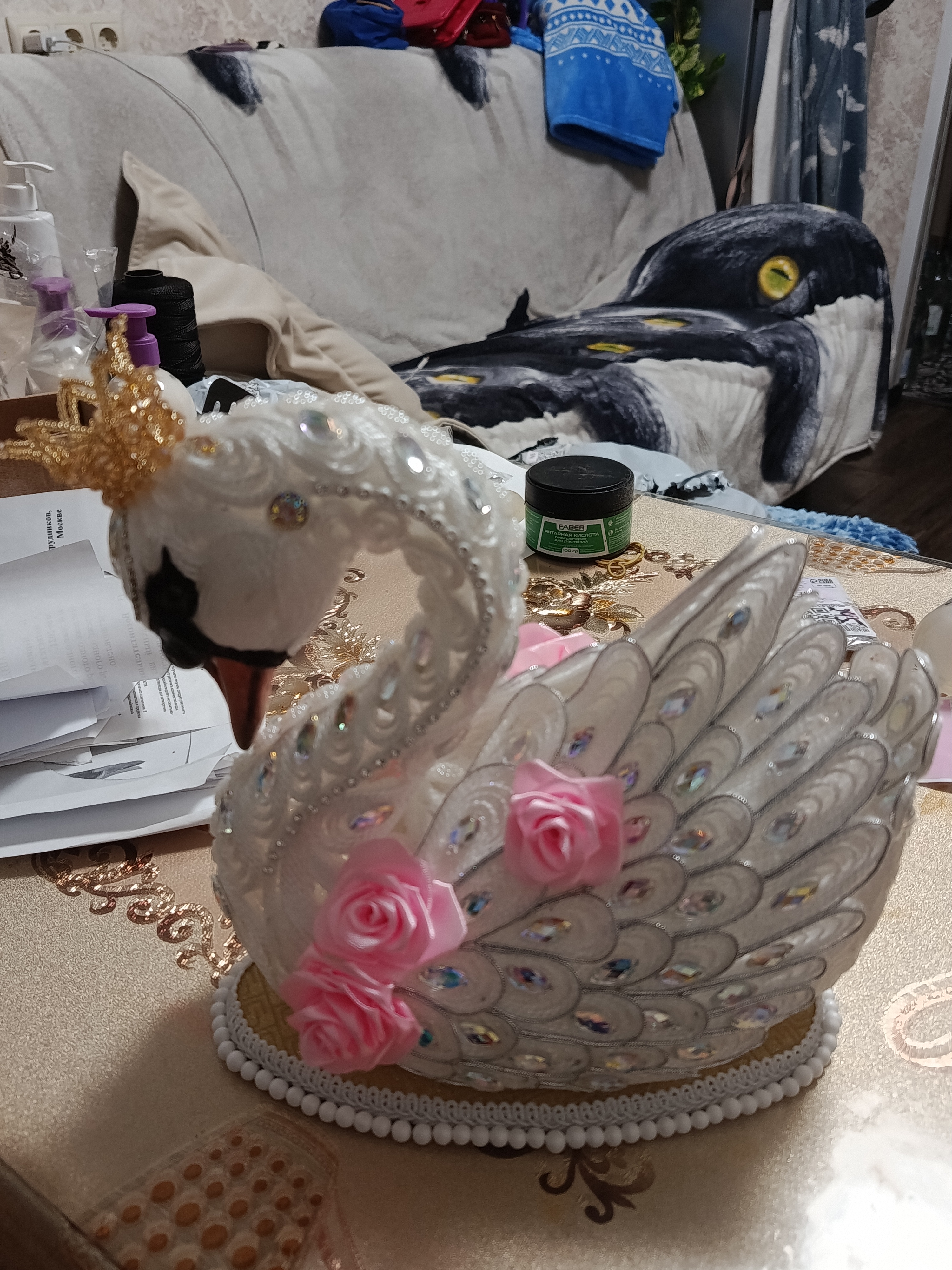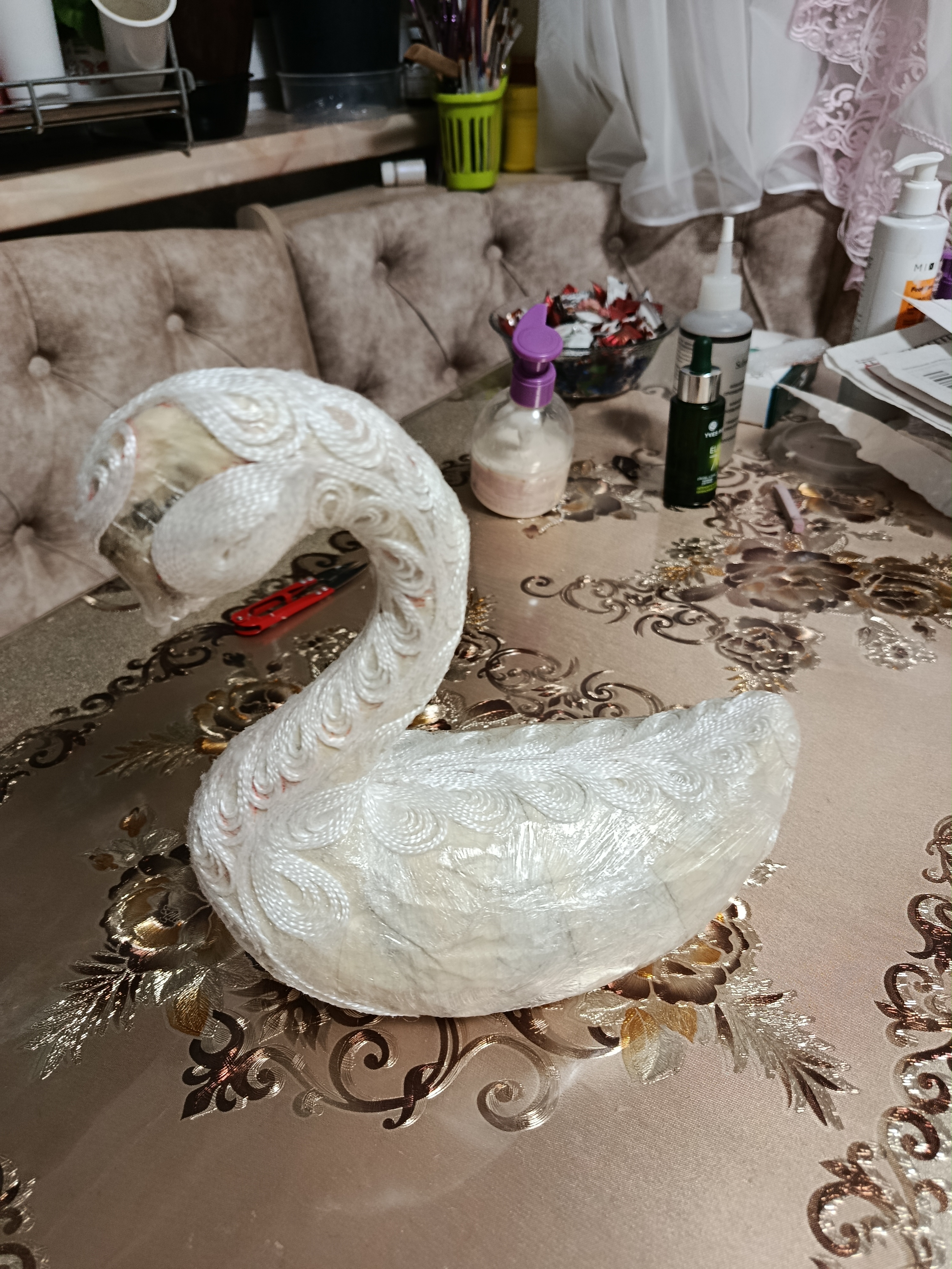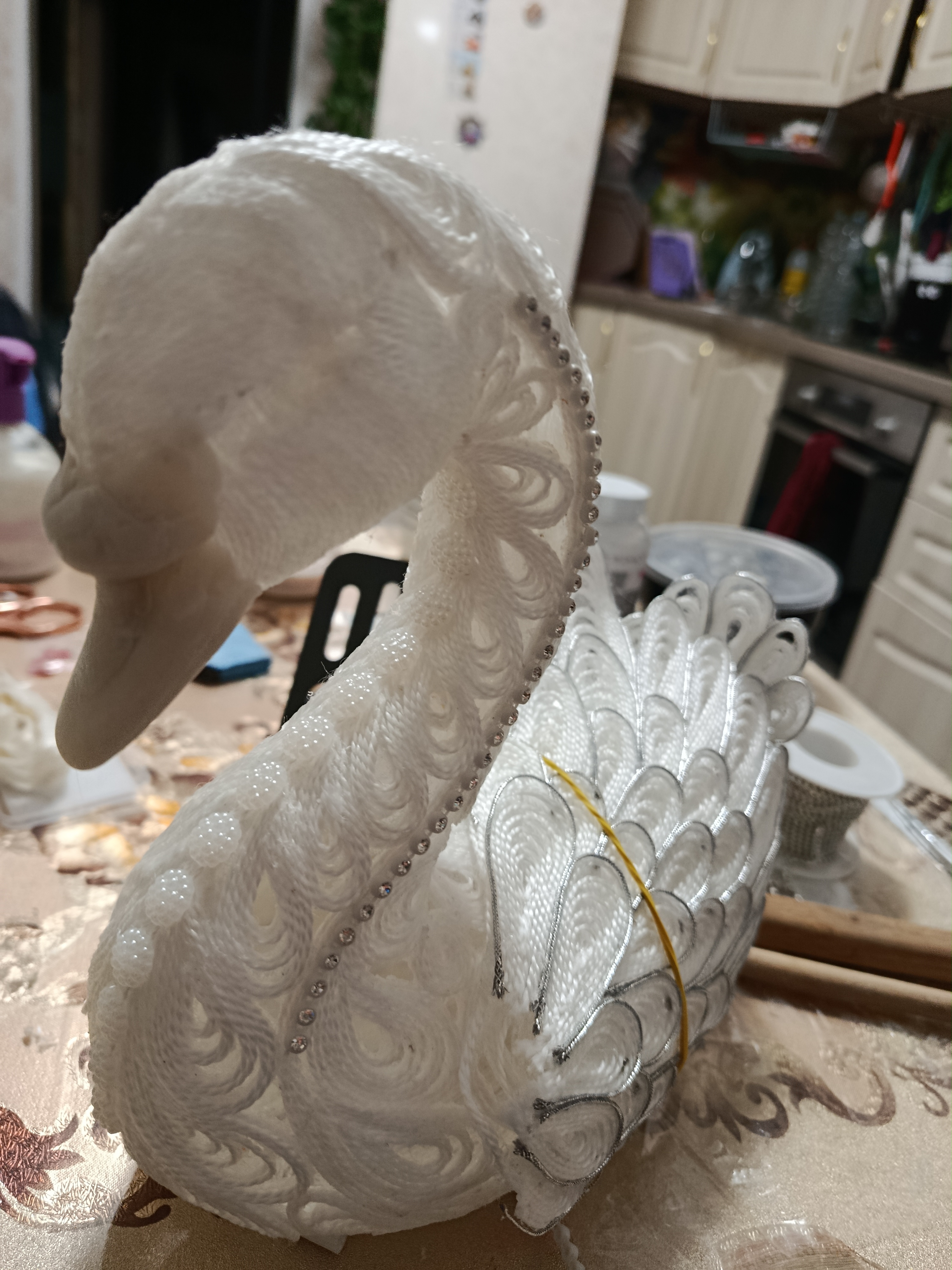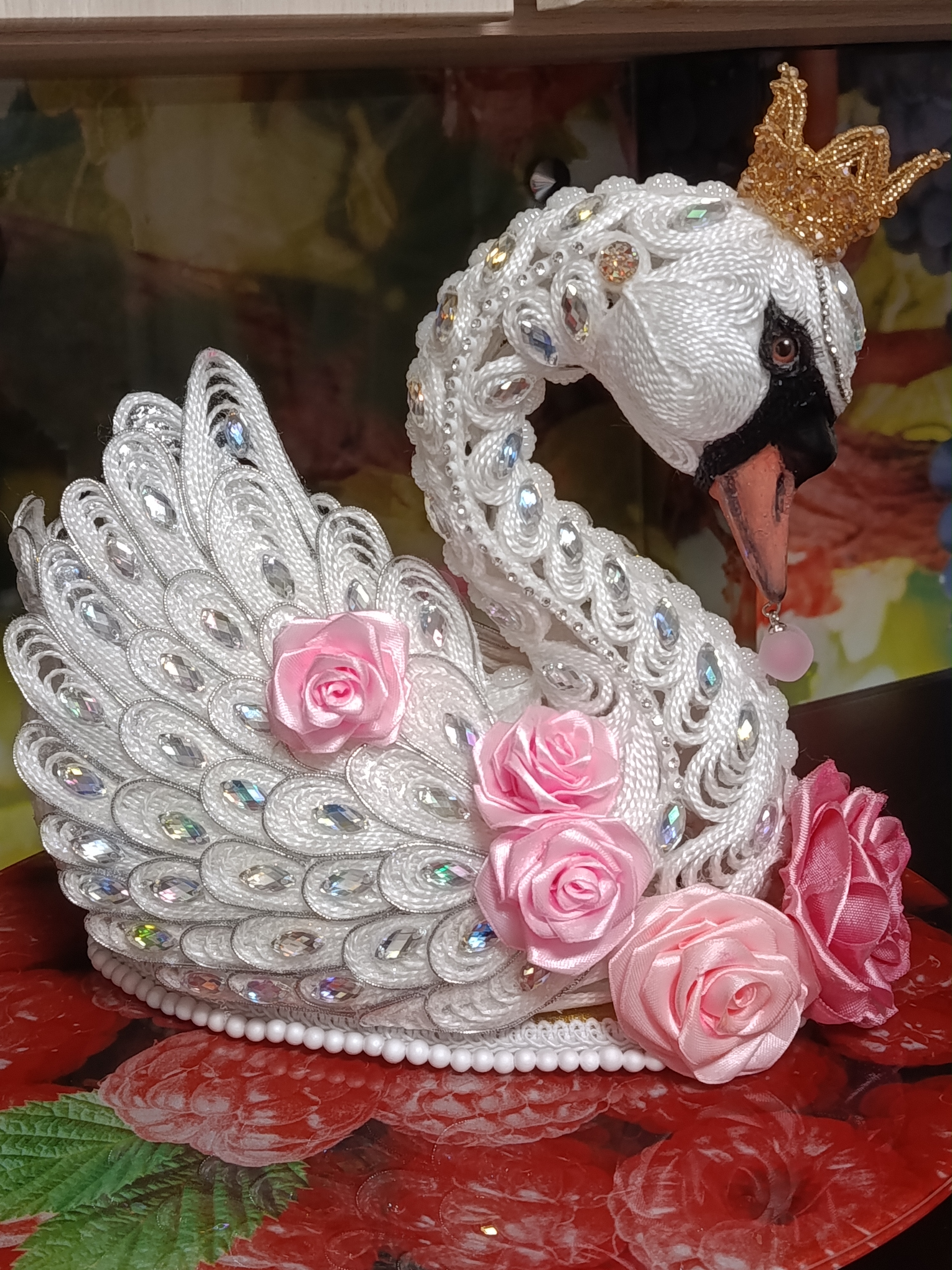Думала-думала и решила сделать символ нежности, любви и верности — Лебедя. По задумке Лебёдушка должна быть иной: в другой технике и в другом материале. И вот когда уже было все куплено, а макет создан, она мне сказала: "Сначала я, а потом - делай, что хочешь."