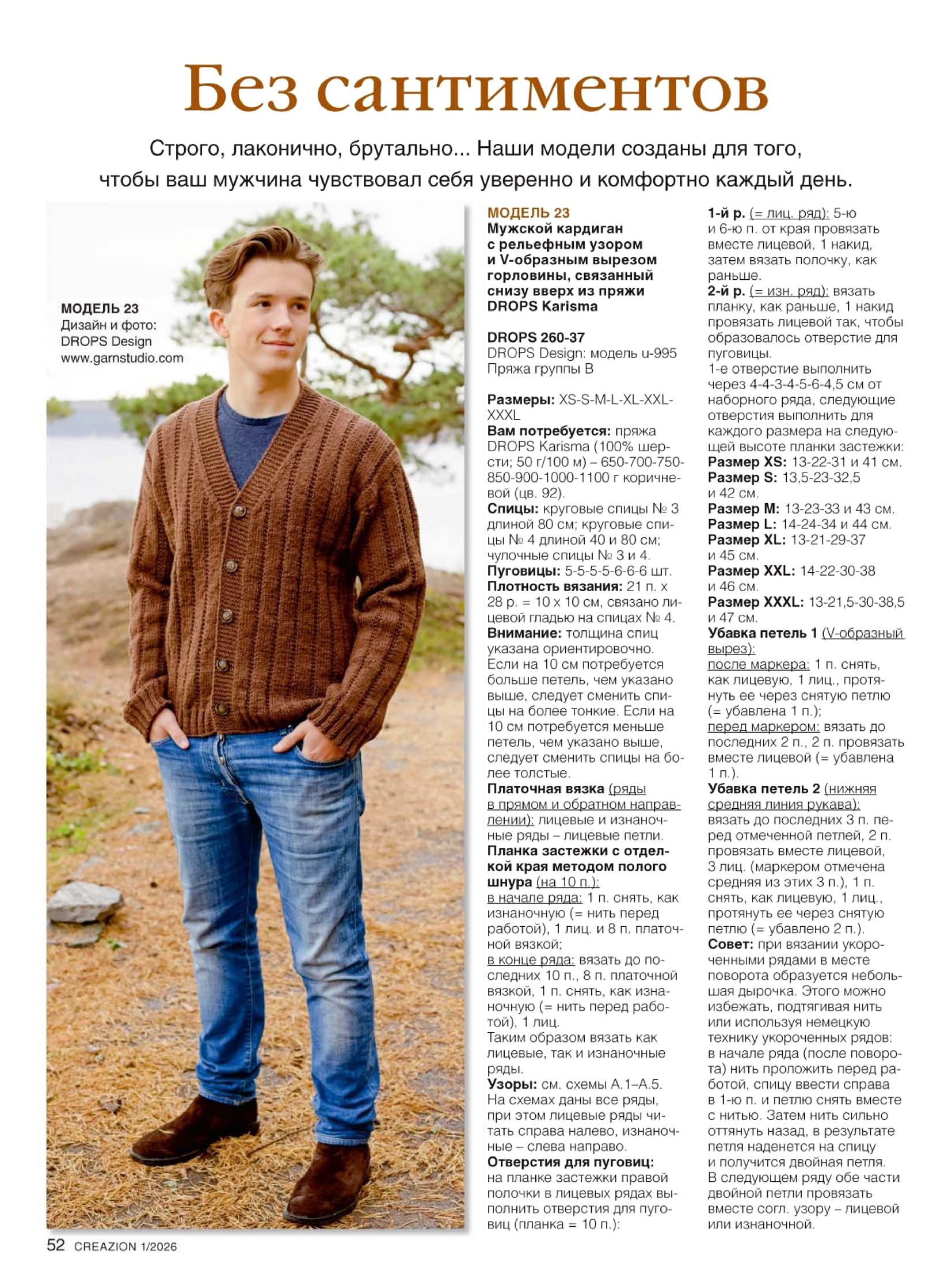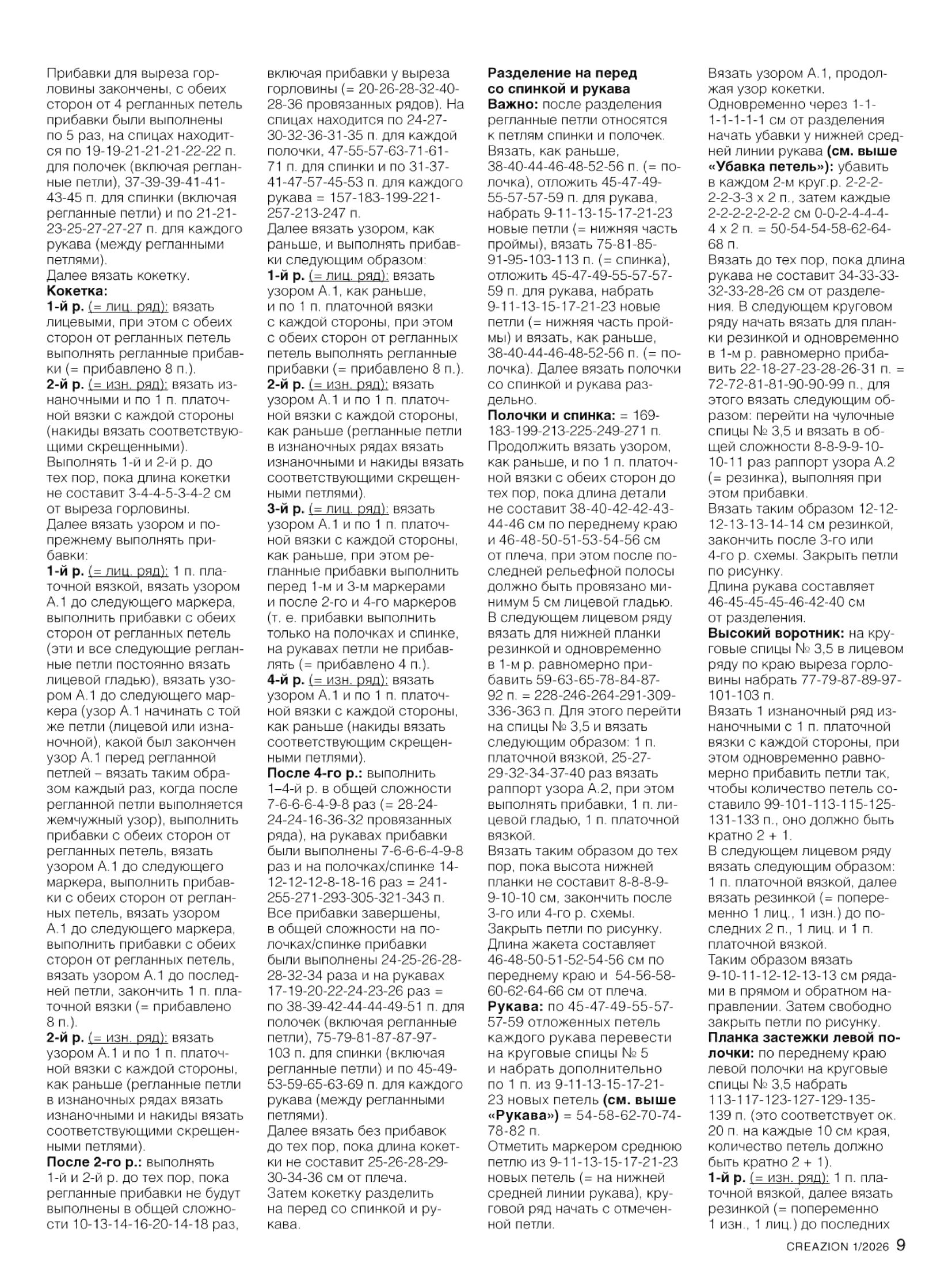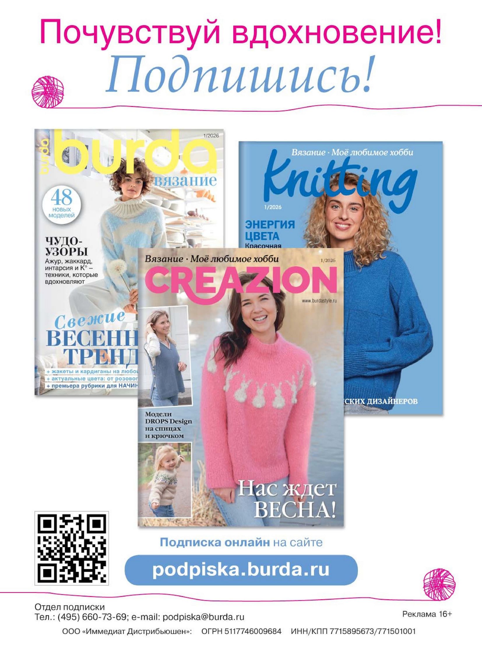 Журнал по вязанию предлагает практичные и одновременно креативные модели европейских дизайнеров. В номере коллекция трикотажа нового сезона, в которой успешно сочетаются базовые и оригинальные модели, связанные на спицах или крючком. Привлекательные детали, а также разнообразные узоры - жаккардовые, ажурные, рельефные - придутся по вкусу самым искушенным любителям вязания.
