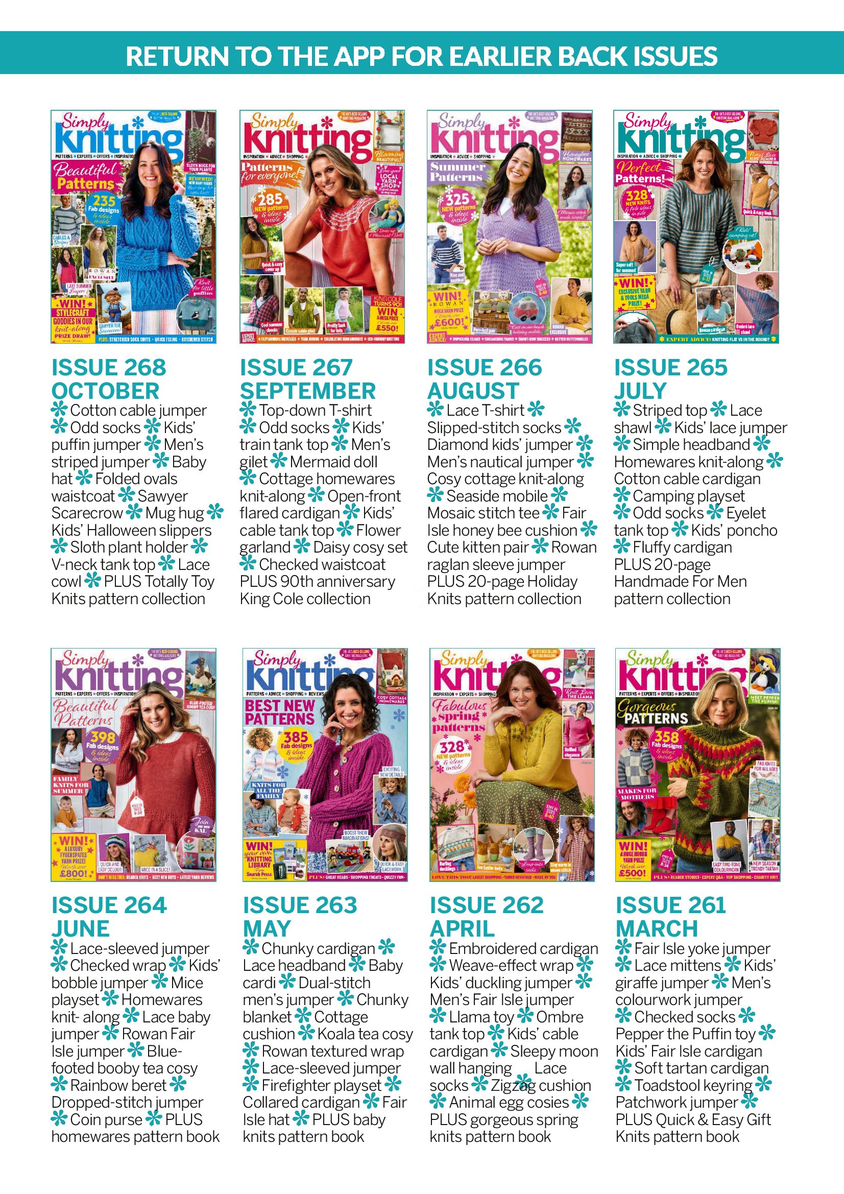 Журнал по вязанию спицами. В каждом выпуске представлено более 20 моделей одежды и аксессуаров для взрослых и детей, интересные идеи для создания уюта в вашем доме. В номере много творческих идей для тех, кто любит вязать. Красивые проекты одежды, игрушки, предметы интерьера для дома, модные аксессуары и идеи подарков на все случаи жизни.