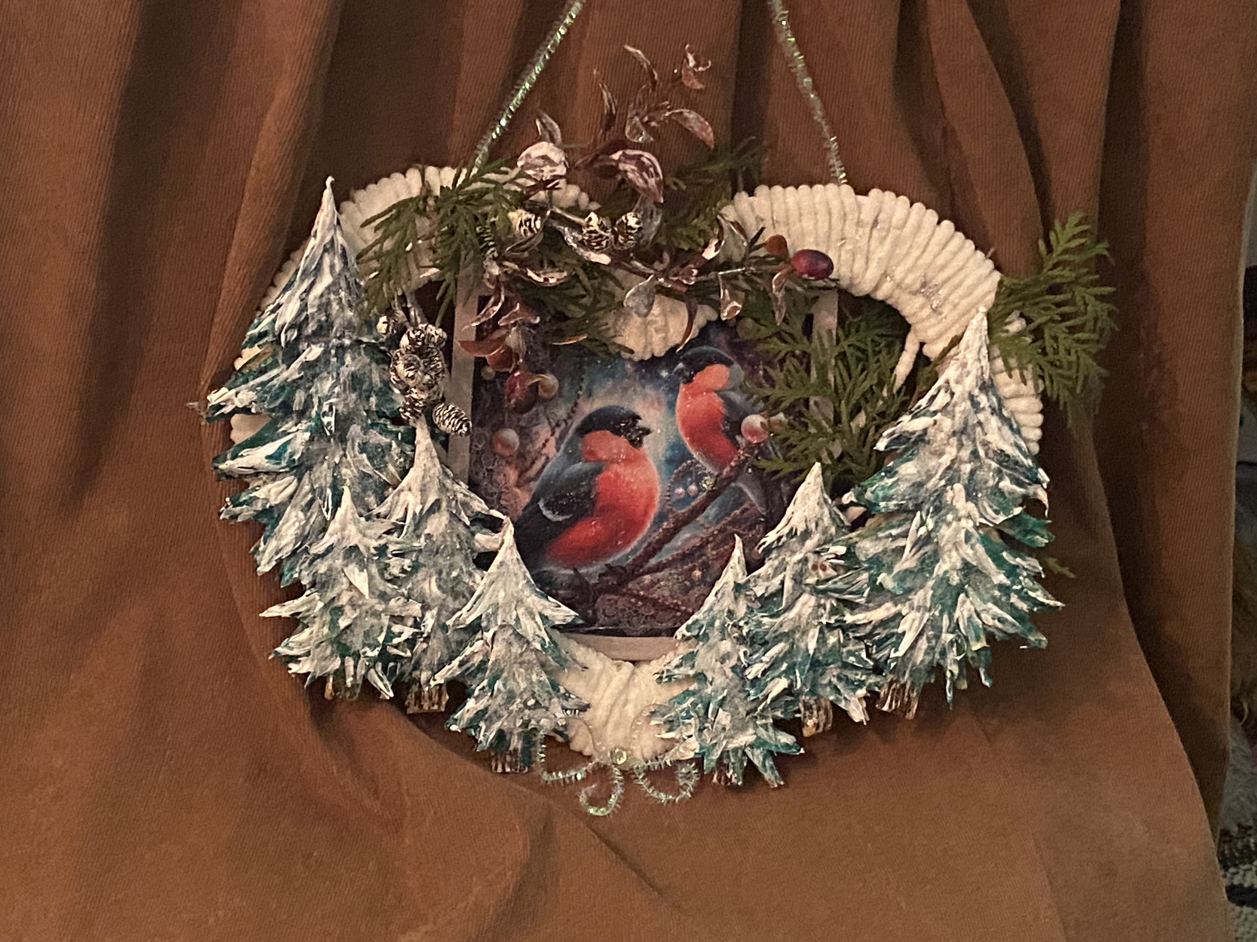Картинку закрепила на клей Титан, а вокруг художественно распределила елки. Еще нашла веточку с ягодами гармонирующими цветами со снегирями и тоже закрепила ее сверху. И небольшие веточки туи и соплодия ольхи, слегка под крашеные белым акрилом и глитером дополнили композицию.