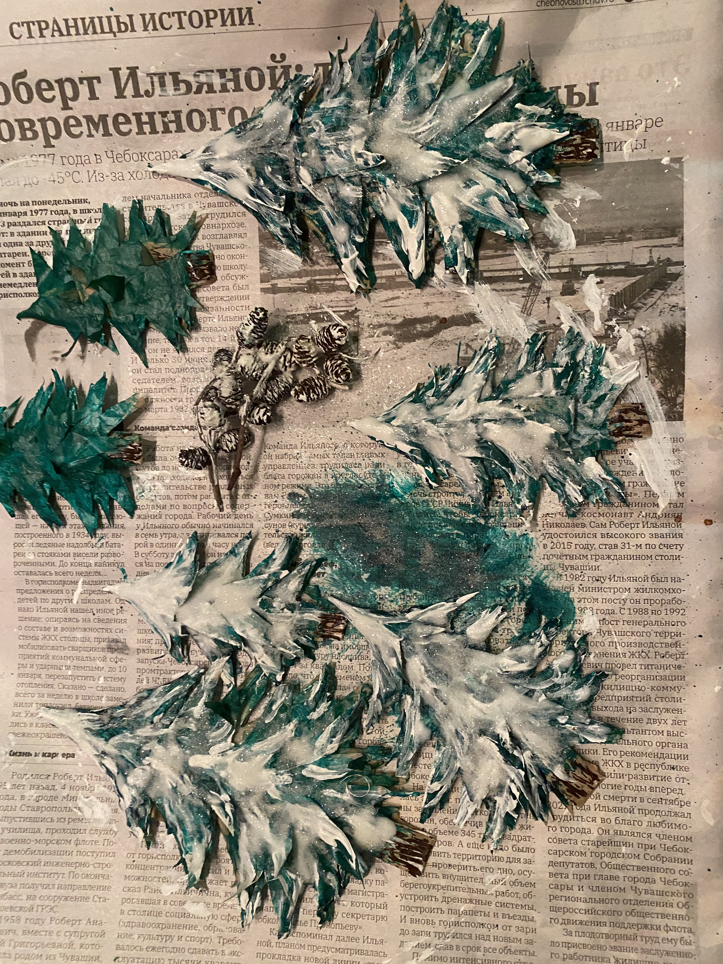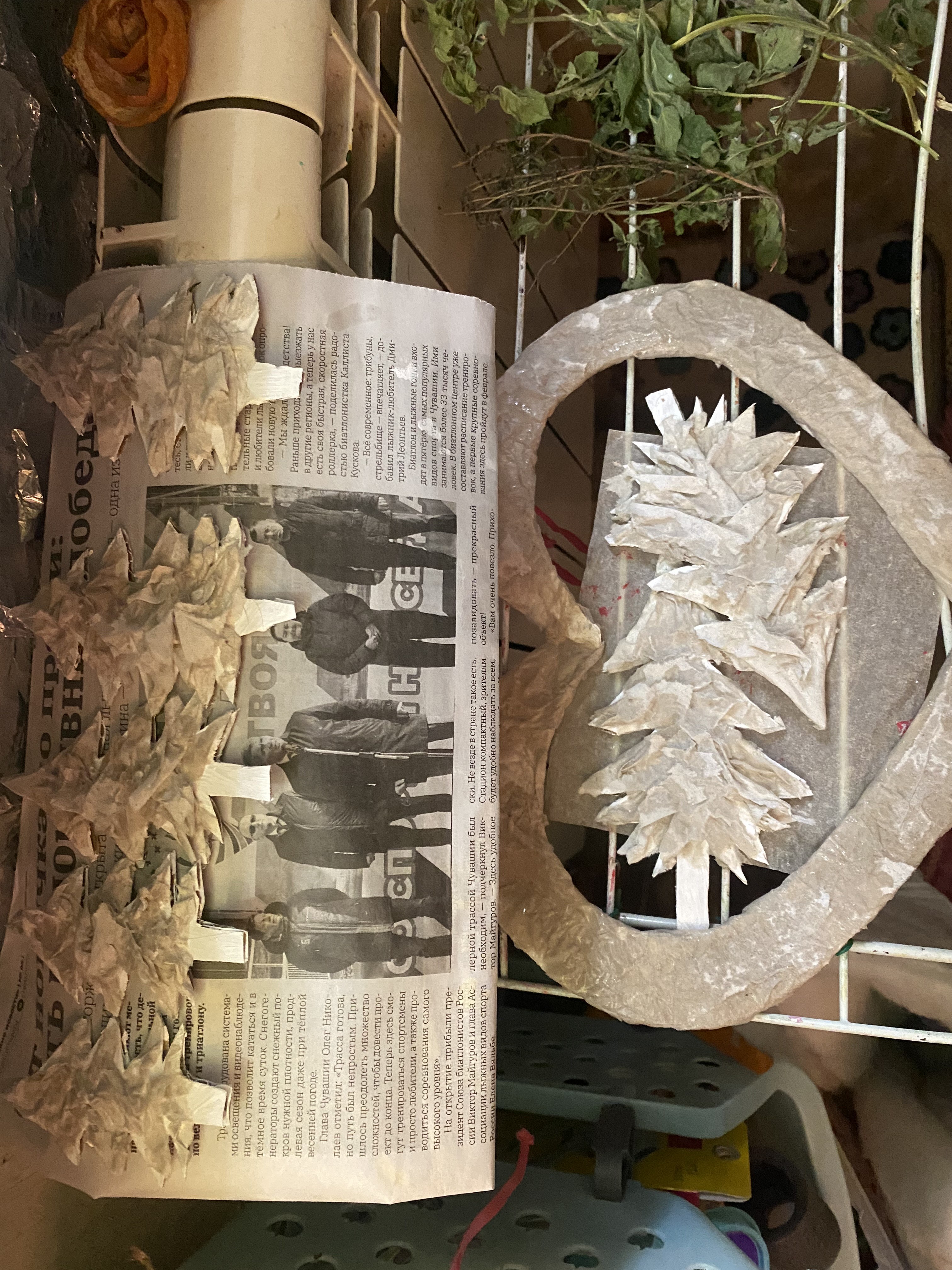 Использовала для этого сначала туалетную бумагу, потом бумагу для выпечки. Каждый раз сушила тщательно. Затем сердце обмотала аккуратно белой пушистой пряжей. А елочки еще раз покрасила белым акрилом и последние слои клеила не плоско, а оставляла свободные концы, имитируя еловые лапки.
