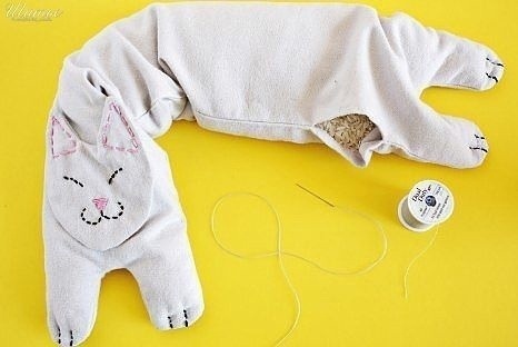 Засыпте рис в мешочек (можно через воронку), зашейте отверстие и поместите котика в микроволновку на 60 сек.
