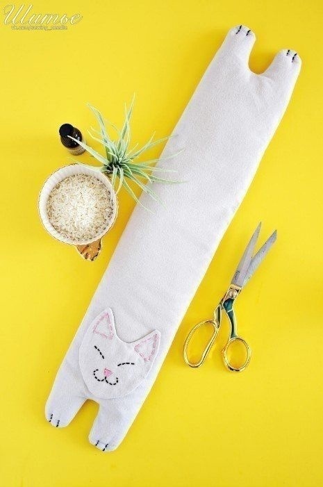 В мешочек в виде котика засыпьте сырой рис и подогрейте в микроволновой печи. Влажная горячая грелка готова.