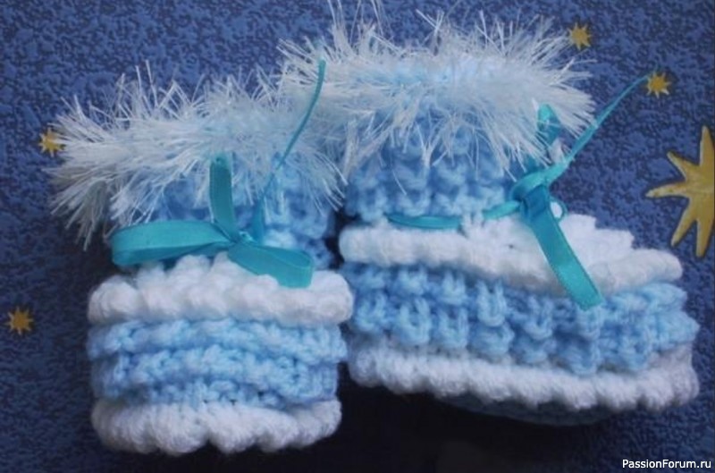 В центре прибавлять 2 петли.На спицах получится 56 петель.Далее вязать 4-5 грядочек нитками другого цвета.Затем снять 23 петли от начала лицевого ряда не провязывая на вспомогательную спицу.Оборвать нить и далее вязать только 10 петель резинкой 2/2,начиная и заканчивая двумя лицевыми.При этом вместе с десятой петлёй провязывать одну от боковины (от 23 петель).По лицу работы вязать две петли вместе лицевой,а петли по изнанке — 2 вместе изнаночной.Так вязать,пока не провяжите с каждой стороны по 12 петель,оставшиеся от каждой боковины 11 петель и средние 10 (всего 32 петли) вязать резинкой 6-8 см, а затем на последних 3 рядах вязать узор «мех» нитками разного цвета.Сшить башмачок.Готово!