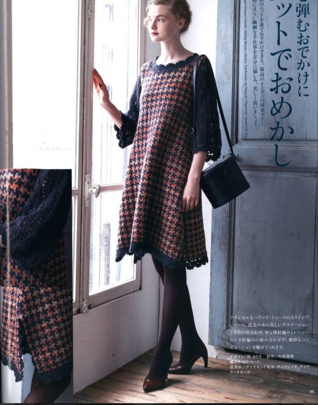 Это изящное платье крючком выполнено в стиле ретро, с элегантным фасоном, создающим легкий и женственный образ. Его богатый узор с глубокими оттенками синего и коричневого придает изделию невесомость и шарм. Рукава три четверти и свободный крой обеспечивают комфорт и стиль, идеально подходя для уютных прогулок или особых случаев.