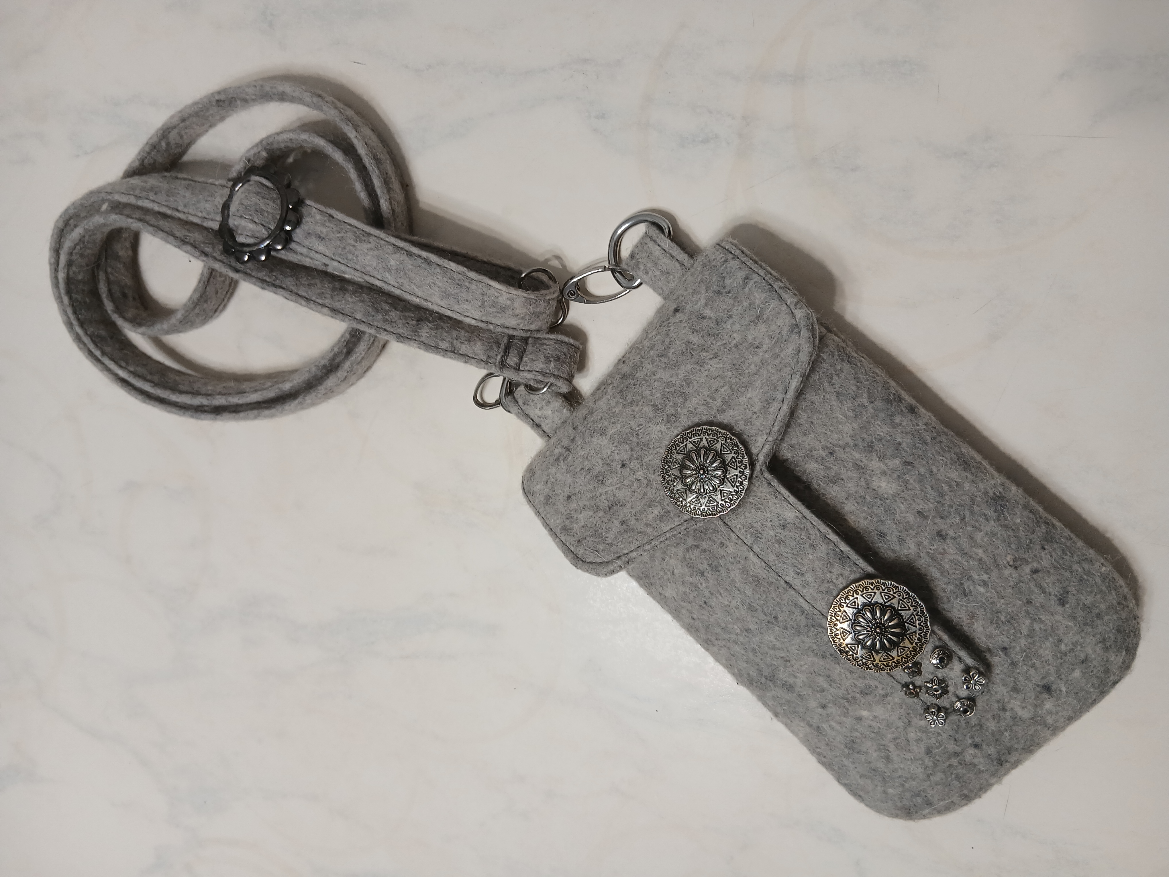 Сваляно и сшито.Два отделения- под телефон и карточки.Фиксируются на пришивных клёпках.
