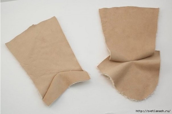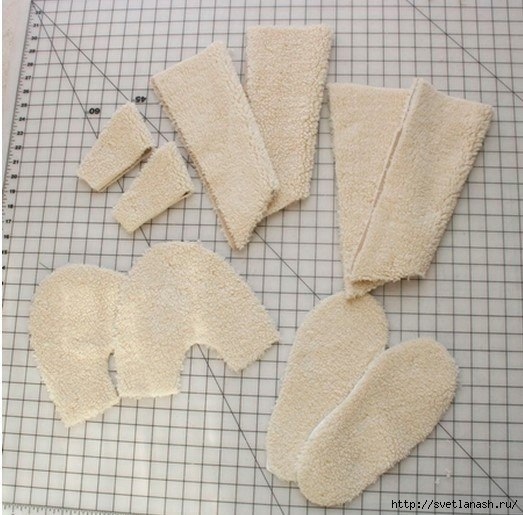 Вырезаем из ткани следующие детали: два пары деталей для голенища, две детали подошвы, две детали верха. Отдельно можно вырезать полосочки, которые послужат декоративной опушкой сапожек.