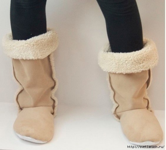 Сшиваем детали попарно, складывая их лицевой стороной внутрь. Отдельно сшиваем голенище, отдельно пришиваем верх к подошве. Совмещаем детали и сшиваем сапожки. Домашние угги своими руками готовы.