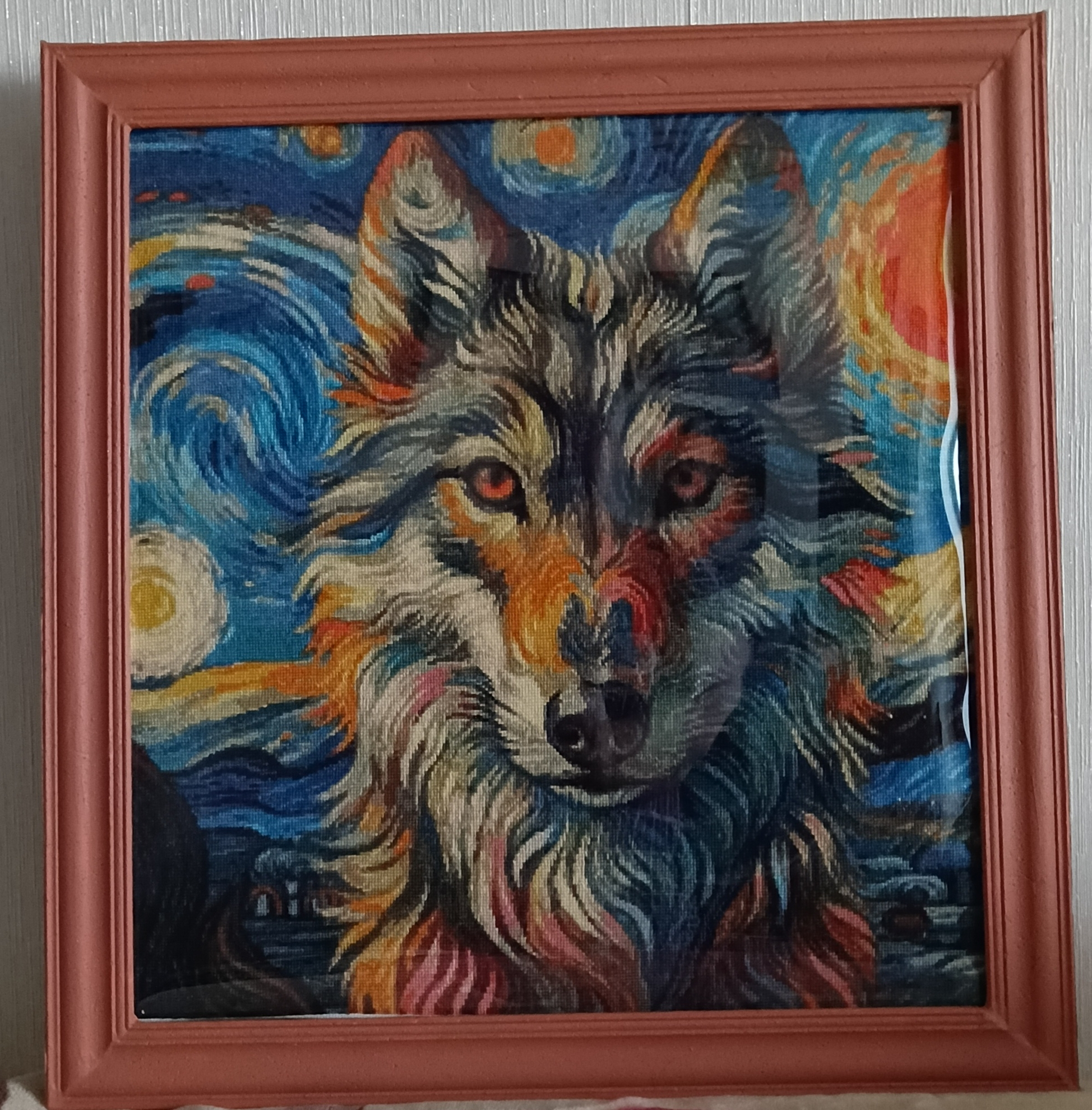 Всем большой привет! 10 февраля я завершила работу над радужным зверем,волком или собакой-кому как нравится.А начинала я его 15 августа прошлого года.Рамку сделала из пенопластового потолочного молдинга.