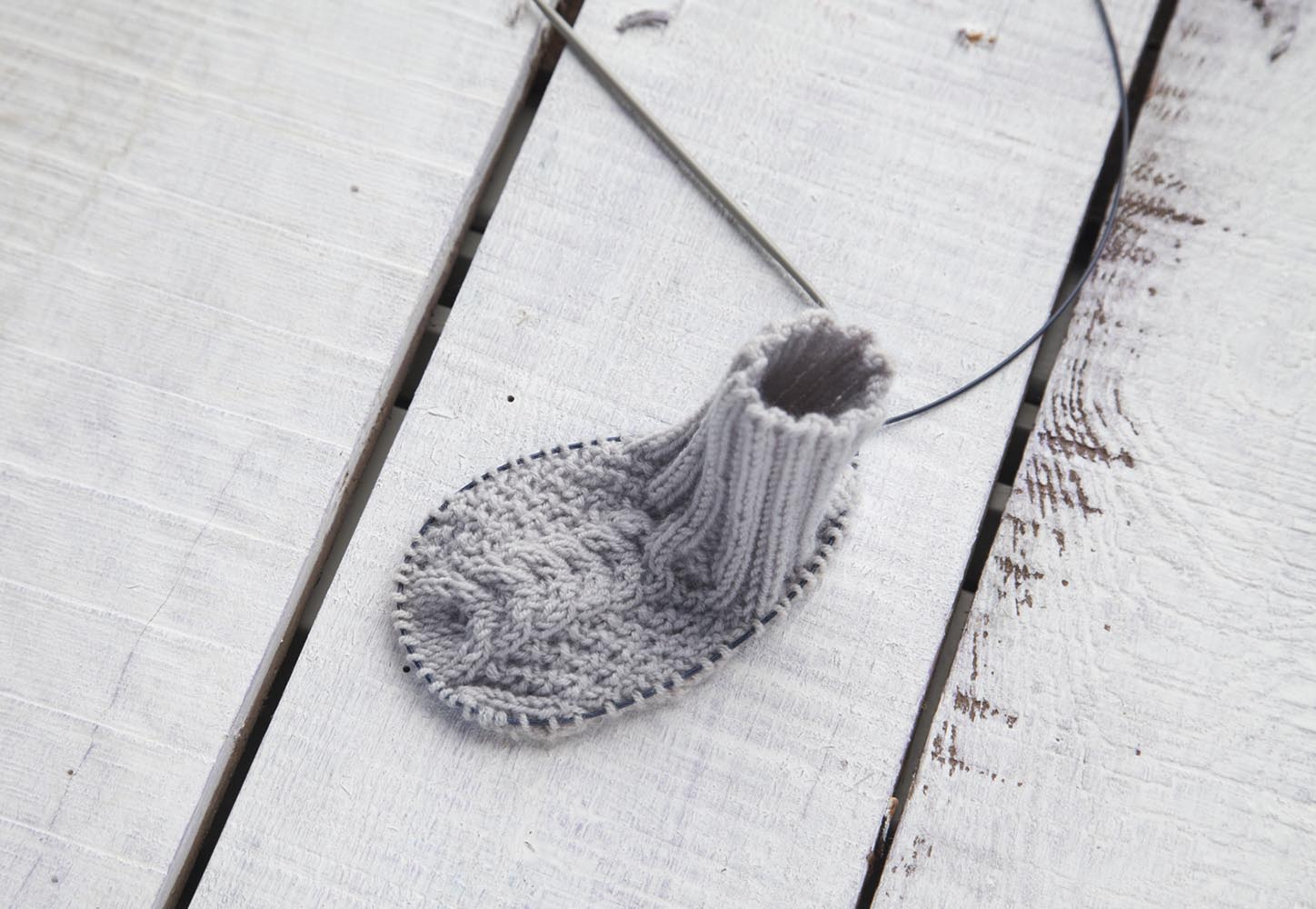 Пряжа (100% овечьей шерсти; 185 м/50 г) — 50 г светло-серой; чулочные спицы №3,5; круговые спицы №3,5 длиной 50 см; 1 вспомогательная спица;игла для шерстяных ниток; заготовки для подошв из светло-серой кожи.