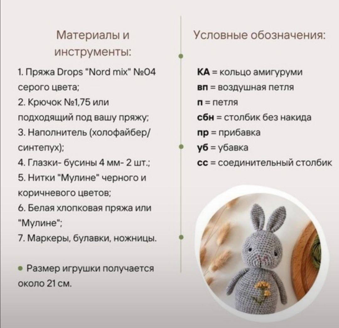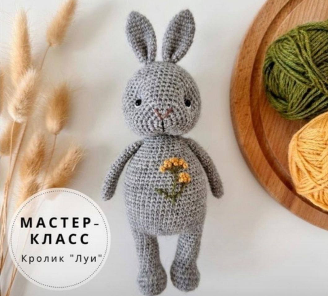 Мягкий серый кролик, связанный крючком с особым вниманием к деталям, украшен аккуратной вышивкой желтых цветов на животике. Его выразительные черные глазки и маленький носик придают игрушке живой и трогательный вид. Ушки стоят торчком, а лапки слегка изогнуты, что делает фигуру более реалистичной и милой. Идеальное сочетание текстуры и цвета, создающее уютный и нежный образ.