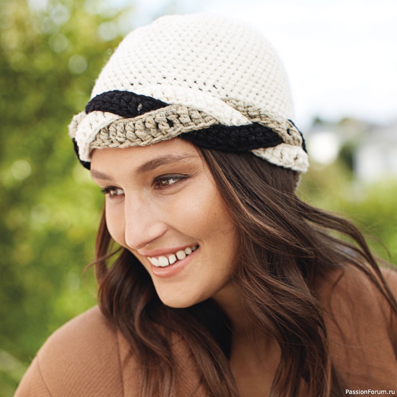Оригинальная шапочка окантована косой, сплетенной из трех связанных крючком полосок. Простое и необычное решение