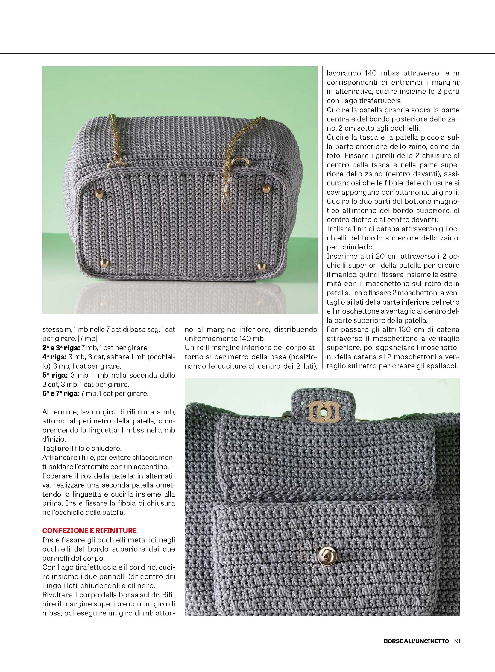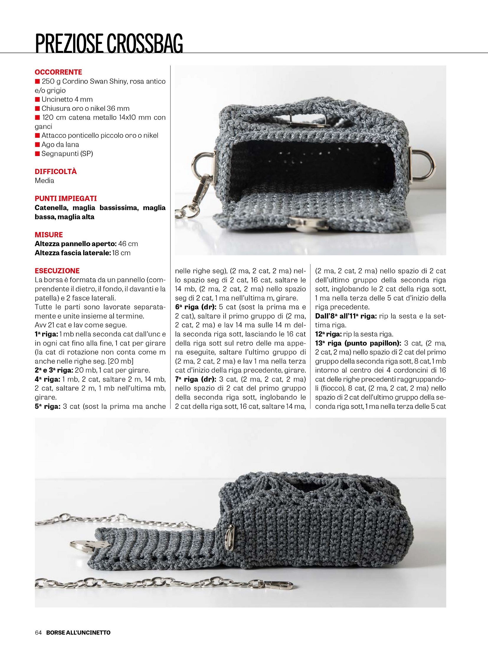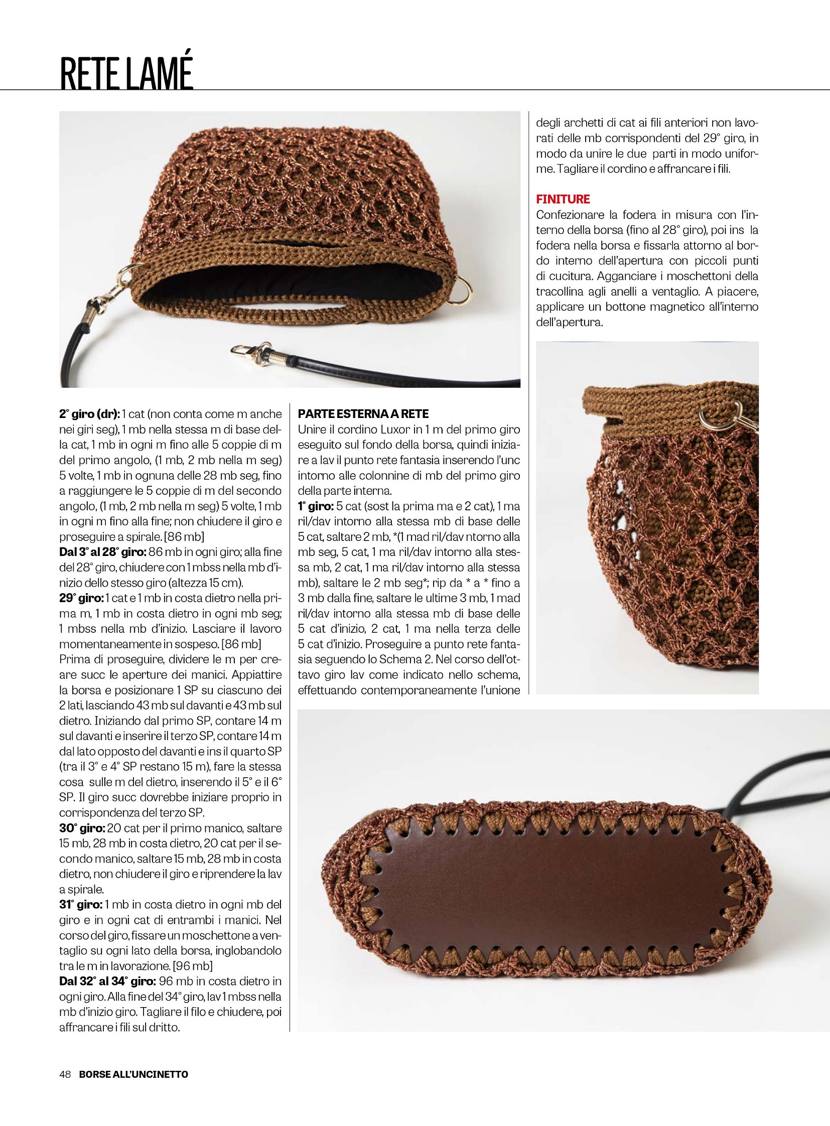 Итальянский журнал по вязанию крючком различных моделей для женщин: жакеты, топы, кофточки, аксессуары и многое другое. Выпуск посвящен вязанию крючком сумок. Качественные схемы к каждому изделию прилагаются.