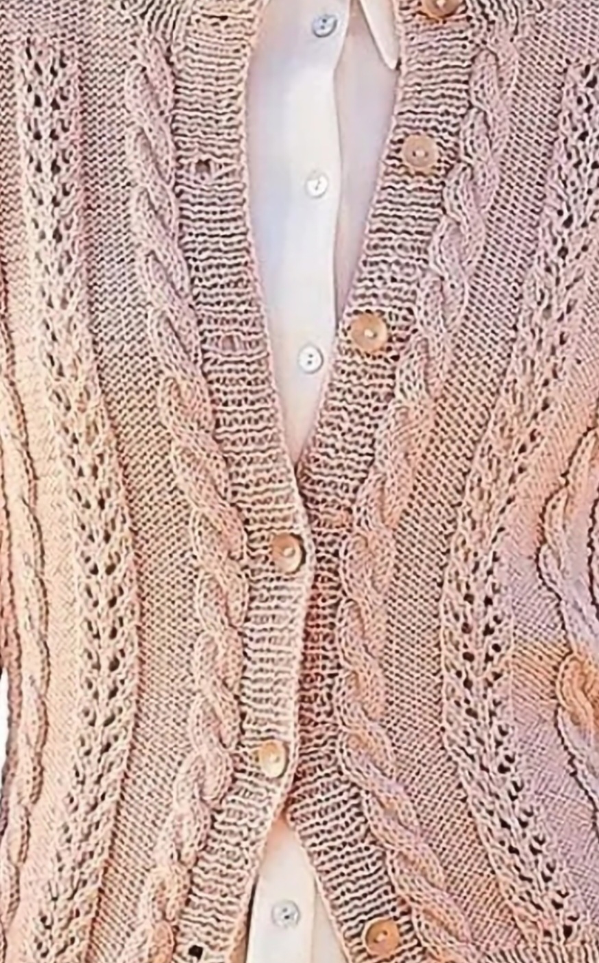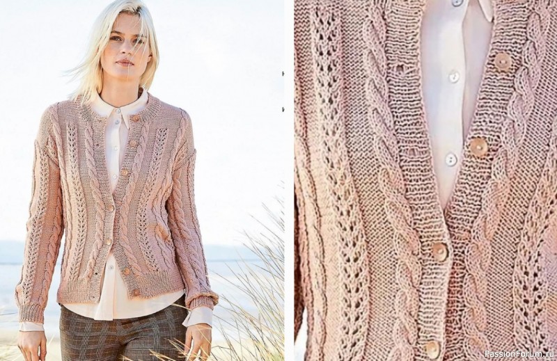 Красивый жакет с косами и полосами ажурного узора — образец женственности.