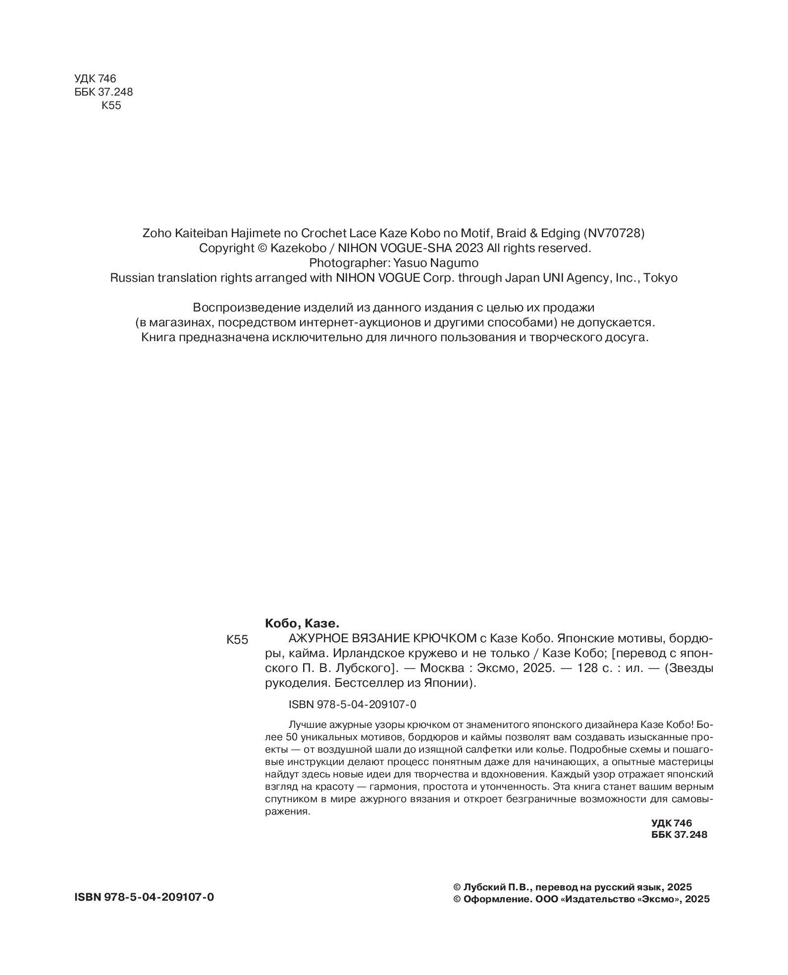 Уникальная коллекция изысканных ажурных мотивов от легендарной Казе Кобо! Ее узоры полюбились вязальщицам по всему миру за изысканность и легкость в исполнении. В этой книге всемирно известная вязальщица собрала лучшие ажурные мотивы, бордюры и кайму, чтобы вы могли воплотить в жизнь десятки уникальных проектов – от воздушной шали до изящной салфетки или колье.