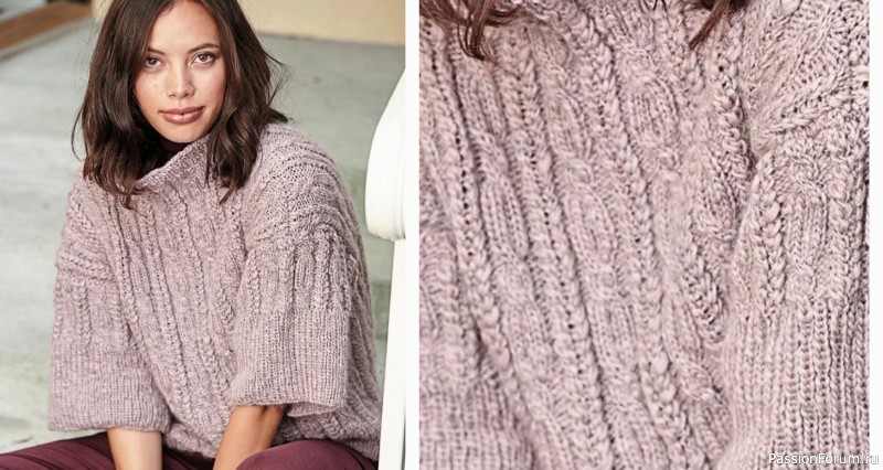 Чудесные рельефные «косы» составляют основу дизайна этого бледно-сиреневого джемпера с широкими рукавами ½ и просторной горловиной.