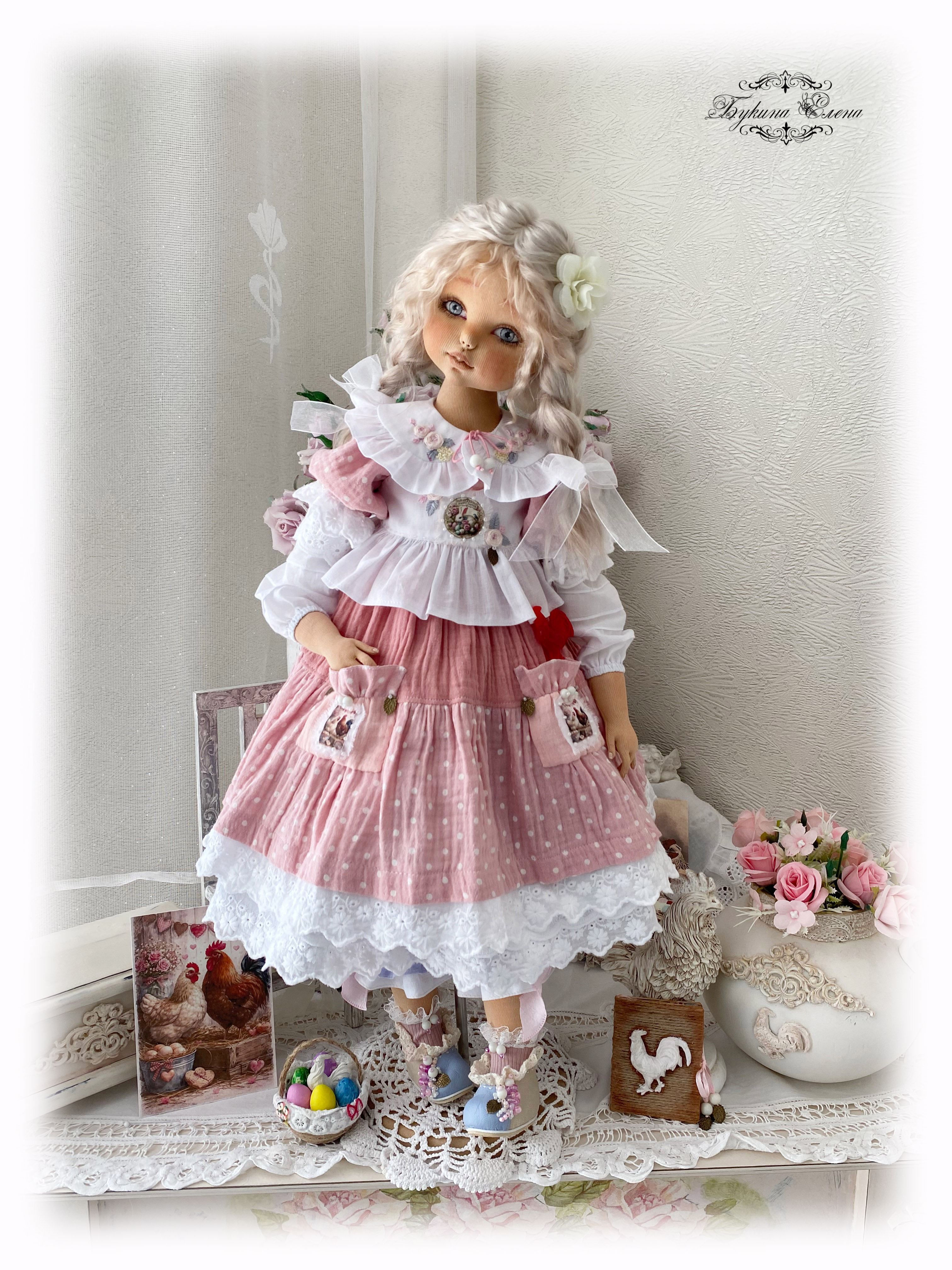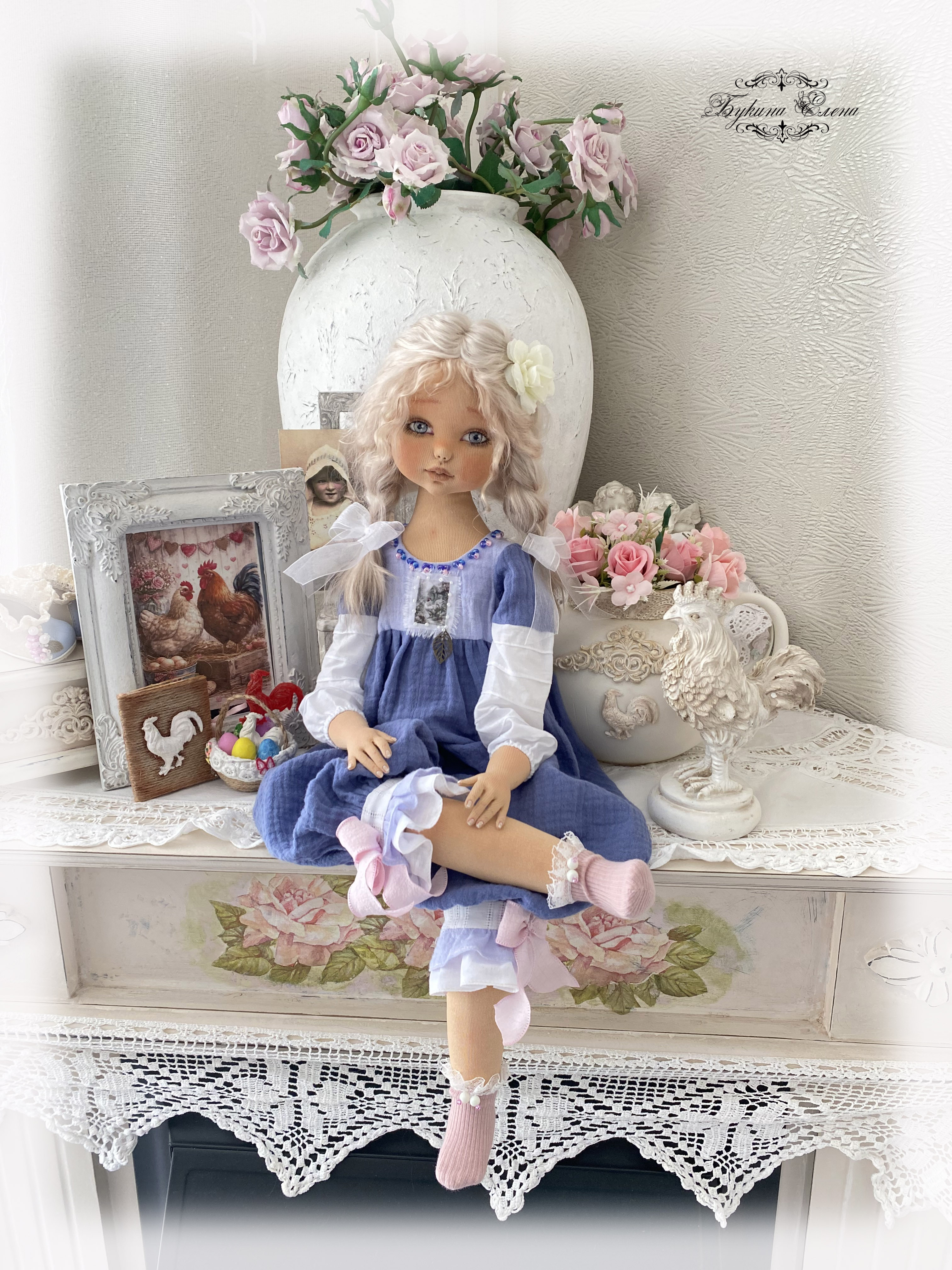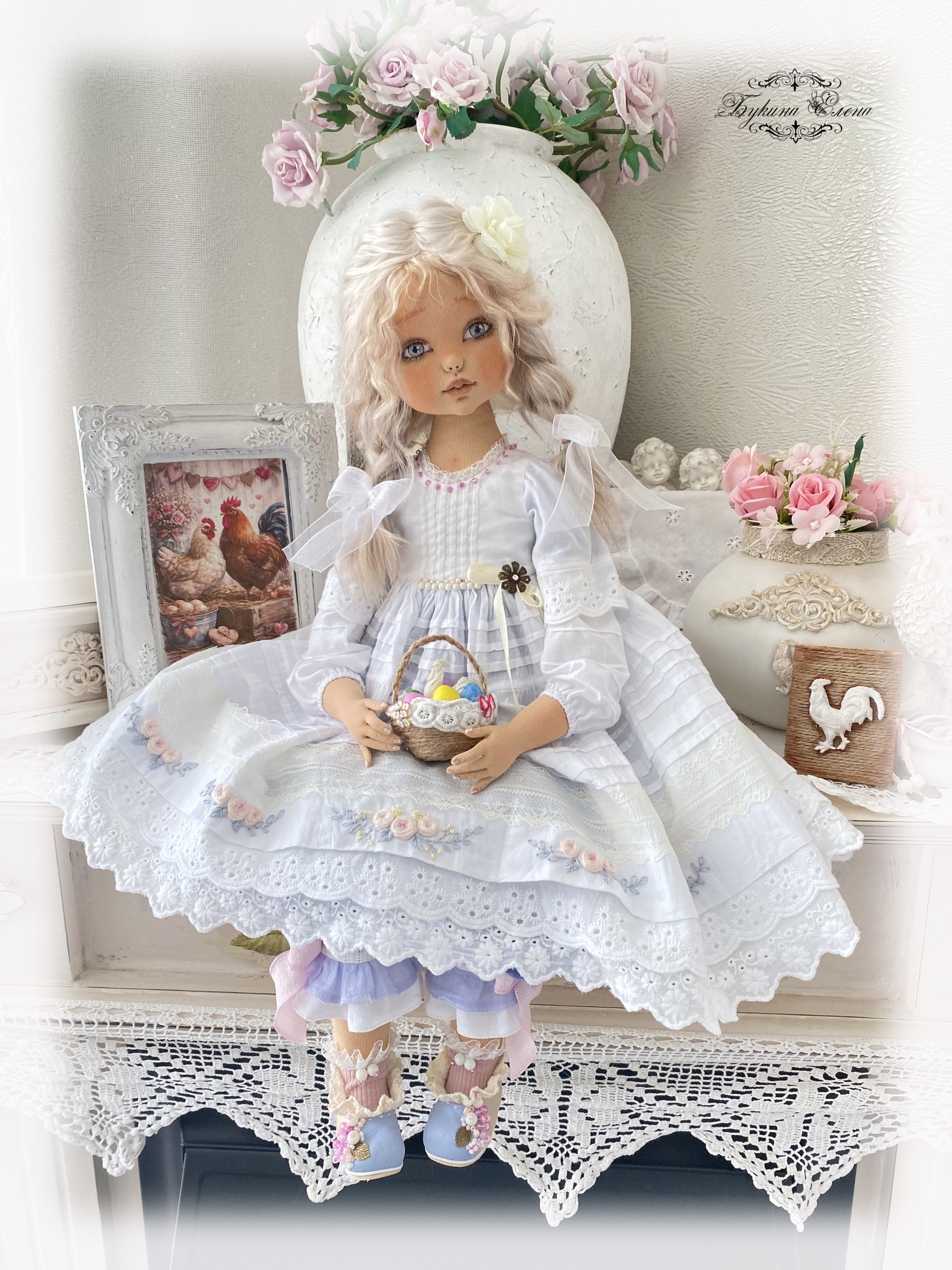 Маняша. Коллекционная текстильная кукла. Малышка сшита из хлопка, обтянута трикотажем. Личико объёмное. Девчушка вся подвижная. Головушка крутится и немного наклоняется. Ручки и ножки крепятся, как у будуарных кукол или куклы-болтушки. Манечка стоять не хочет, зато она умеет красиво сидеть и мило складывать ручки. Пальчики на ручках гнутся, есть маникюр, педикюр. Волосы — натуральная козочка, очень мягкие, можно аккуратно расчесывать, закручивать, менять прическу. Вся одежда съёмная, кроме комбинезона. Одежка сшита из хлопка, муслина, батиста, кружевного полотна,украшена кружевом, бисером, вышивкой. Туфельки из натуральной кожи. У манечки есть сладкий петушок на палочке, корзинка с пасхальными яйцами. Рост куколки около 55 см. Паспорт прилагается, в комплекте открыточки.Актуальна длительная рассрочка.