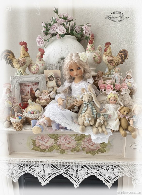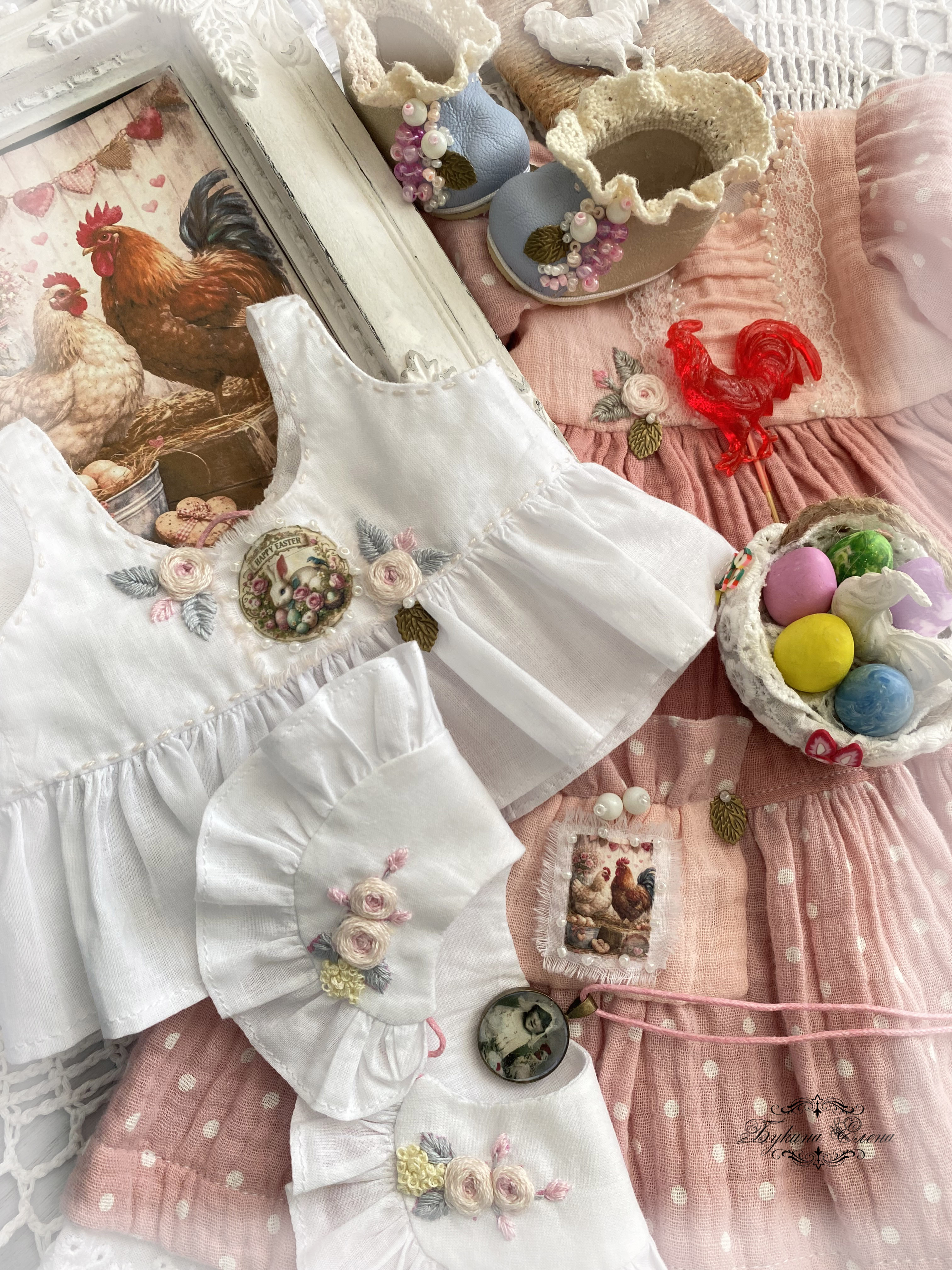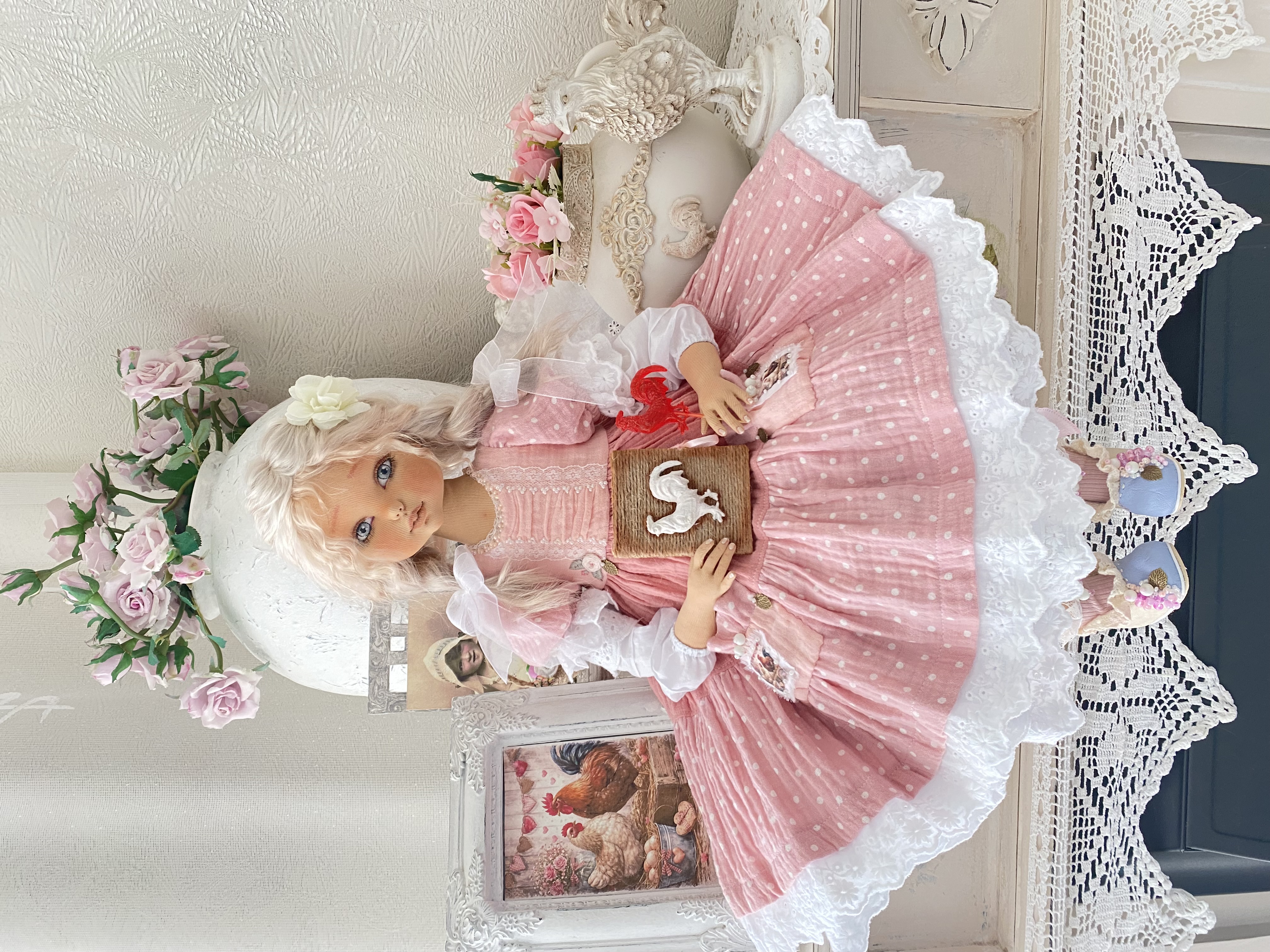 Маняша. Коллекционная текстильная кукла. Малышка сшита из хлопка, обтянута трикотажем. Личико объёмное. Девчушка вся подвижная. Головушка крутится и немного наклоняется. Ручки и ножки крепятся, как у будуарных кукол или куклы-болтушки. Манечка стоять не хочет, зато она умеет красиво сидеть и мило складывать ручки. Пальчики на ручках гнутся, есть маникюр, педикюр. Волосы — натуральная козочка, очень мягкие, можно аккуратно расчесывать, закручивать, менять прическу. Вся одежда съёмная, кроме комбинезона. Одежка сшита из хлопка, муслина, батиста, кружевного полотна,украшена кружевом, бисером, вышивкой. Туфельки из натуральной кожи. У манечки есть сладкий петушок на палочке, корзинка с пасхальными яйцами. Рост куколки около 55 см. Паспорт прилагается, в комплекте открыточки.Актуальна длительная рассрочка.