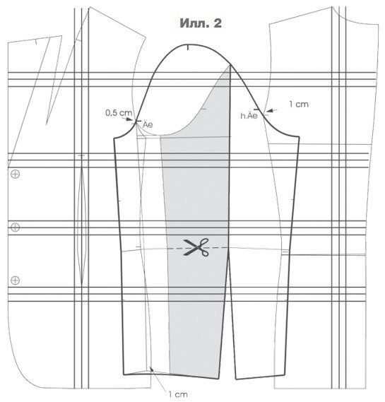 Начертить горизонтально поперечные линии рисунка клеток ткани на окате рукава выше контрольных знаков Ае и h Ае и уточнить их положение, прикладывая рукав к пройме (илл. 2).
