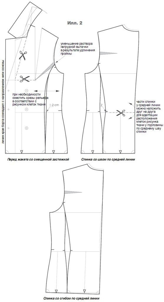 Жакет можно выполнить с отрезными боковыми частями переда и спинки, интегрировав в них вытачки по талии. Продольные срезы боковых частей переда и спинки должны располагаться под прямым углом к низу. Приталивание по срезам рельефов не должно быть слишком большим, чтобы внешний вид модели был гармоничным. Чтобы совместить рисунок клеток ткани у горловины спинки по среднему шву, можно немного изменить спинку по средней линии, как было описано при конструировании блейзера. Если спинка выполняется со сгибом по середине, необходимо начертить линию низа спинки под прямым углом к середине спинки. Важно, чтобы срезы рельефа проходили под прямым углом к линии низа (илл. 2).