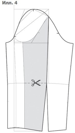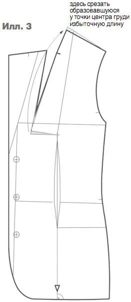 Перед разрезать от угла горловины примерно параллельно линии перегиба лацкана в направлении точки центра груди и затем по горизонтали к точке центра груди. Местоположение вытачки должно быть таким, чтобы она полностью была закрыта лацканом. Соединить боковые стороны нагрудной вытачки от плеча, при этом откроется вытачка от горловины переда жакета. На уровне точки центра груди образуется избыточная длина, которая срезается у вершины горловины переда. Затем начертить новую линию плеча переда, укоротить вытачку под лацканом и оформить боковые линии вытачки. Проконтролировать тождественность длин боковых линий вытачки под лацканом (илл. 3).