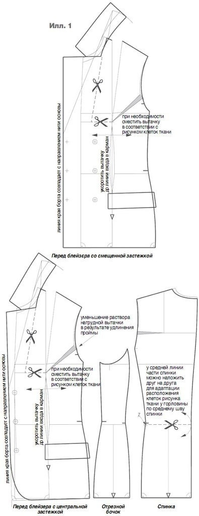 Направление нити основы на отрезном бочке и на спинке начертить под прямым углом к линии низа. Чтобы совместить рисунок клеток ткан и у горловины спинки по среднему шву, можно немного изменить спинку по средней линии. Для этого разрезать спинку по линии талии до среза рельефа и наложить части спинки друг на друга (илл. 1).