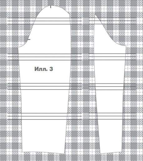 Лекала деталей частей рукава с нанесенными на них контрольными знаками разложить на материале, как показано на иллюстрации 3. Верхний контрольный знак на верхней части рукава располагается посередине продольной полосы рисунка клеток ткани.