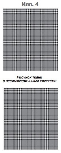 Рисунок ткани может быть с симметричным и несимметричным расположением клеток (илл. 4). Если материал с несимметричной клеткой, то парные детали изделия следует раскраивать в зеркальном отражении.