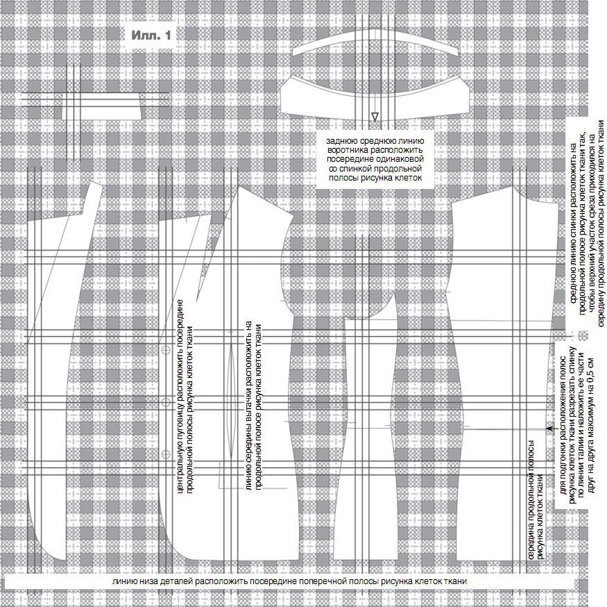 Направление нити основы также указывается под прямым углом к низу и задает направление продольных полос рисунка клеток ткани. Линия низа на всех деталях переда и спинки проходит посередине поперечной полосы рисунка клеток. Центральная пуговица и швы рельефов должны проходить посередине продольной полосы рисунка клеток ткани. Местоположение рельефа можно незначительно сместить вправо или влево, чтобы получить нужный рисунок клеток ткани.