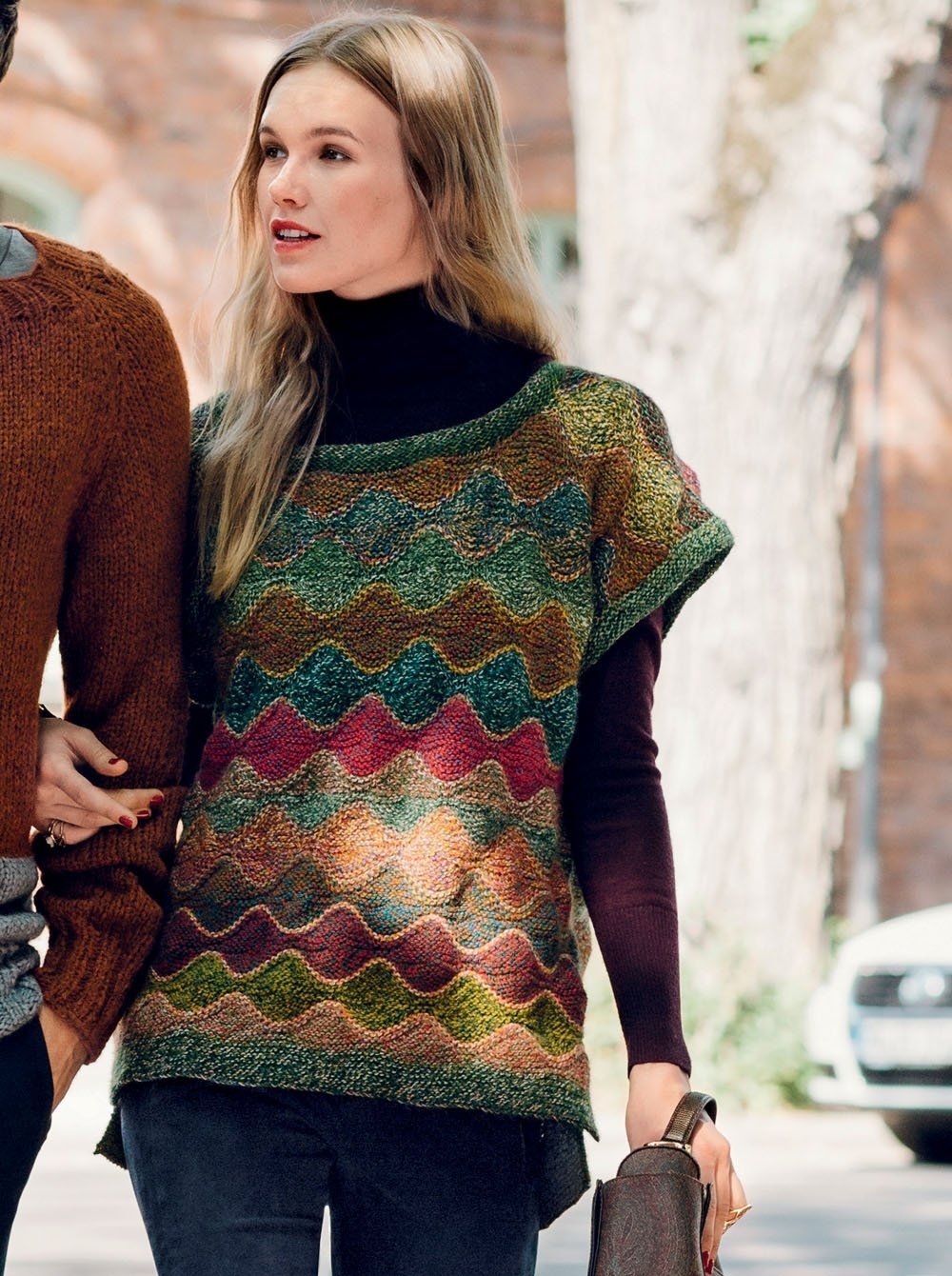 Интересный узор этой безрукавки выполняется нитями разных цветов или из пряжи секционного крашения, но с очень длинными секциями.