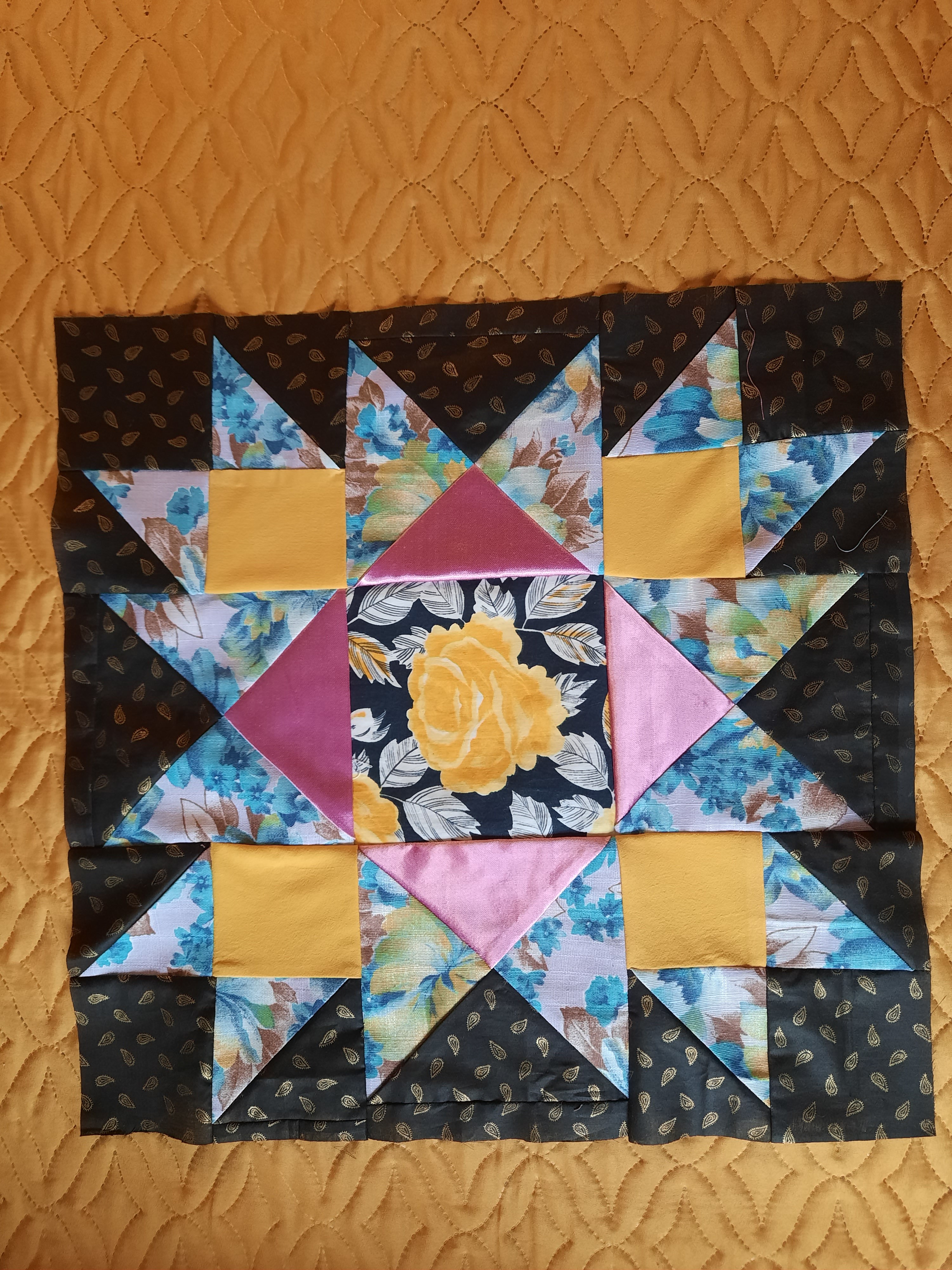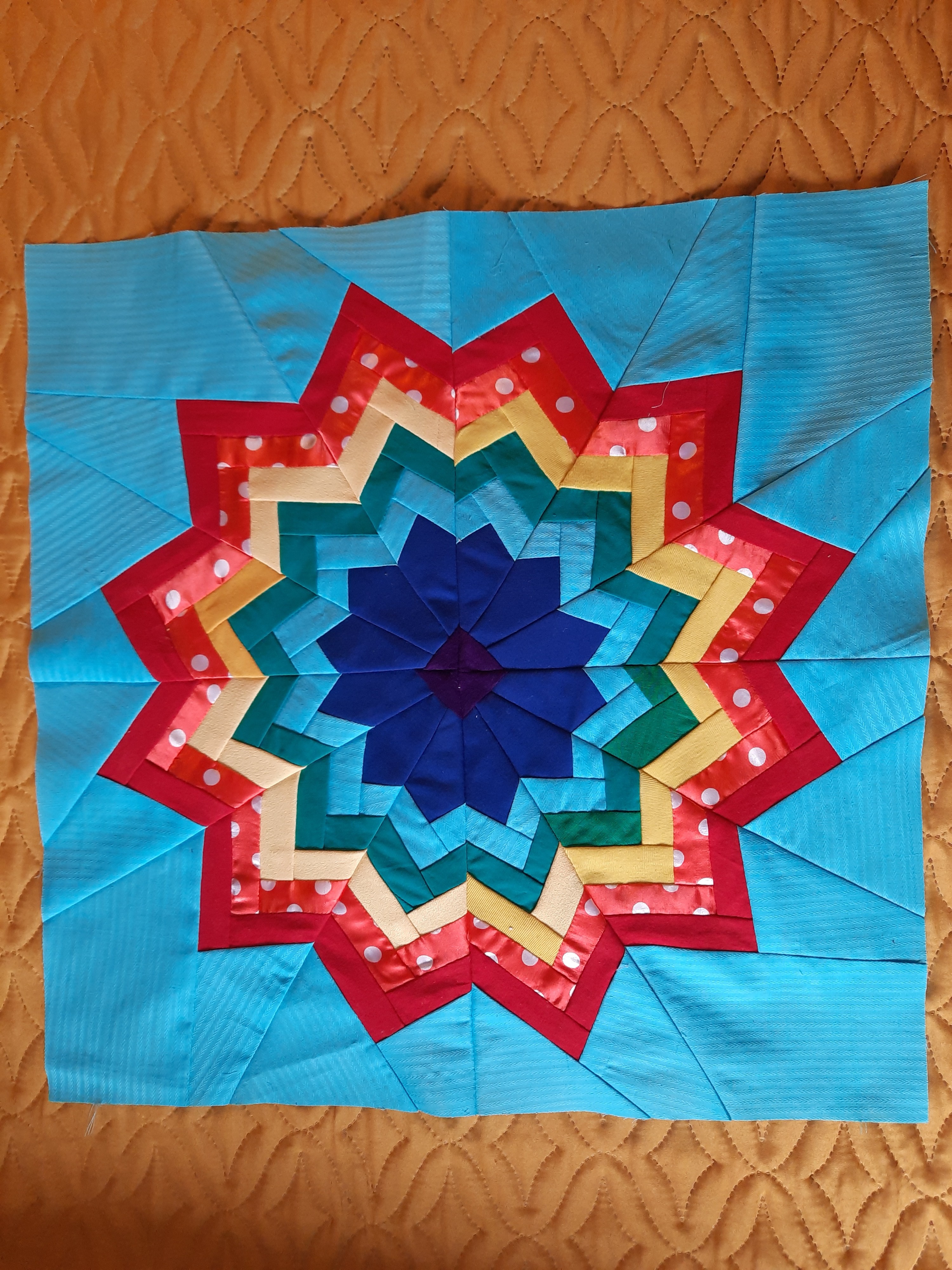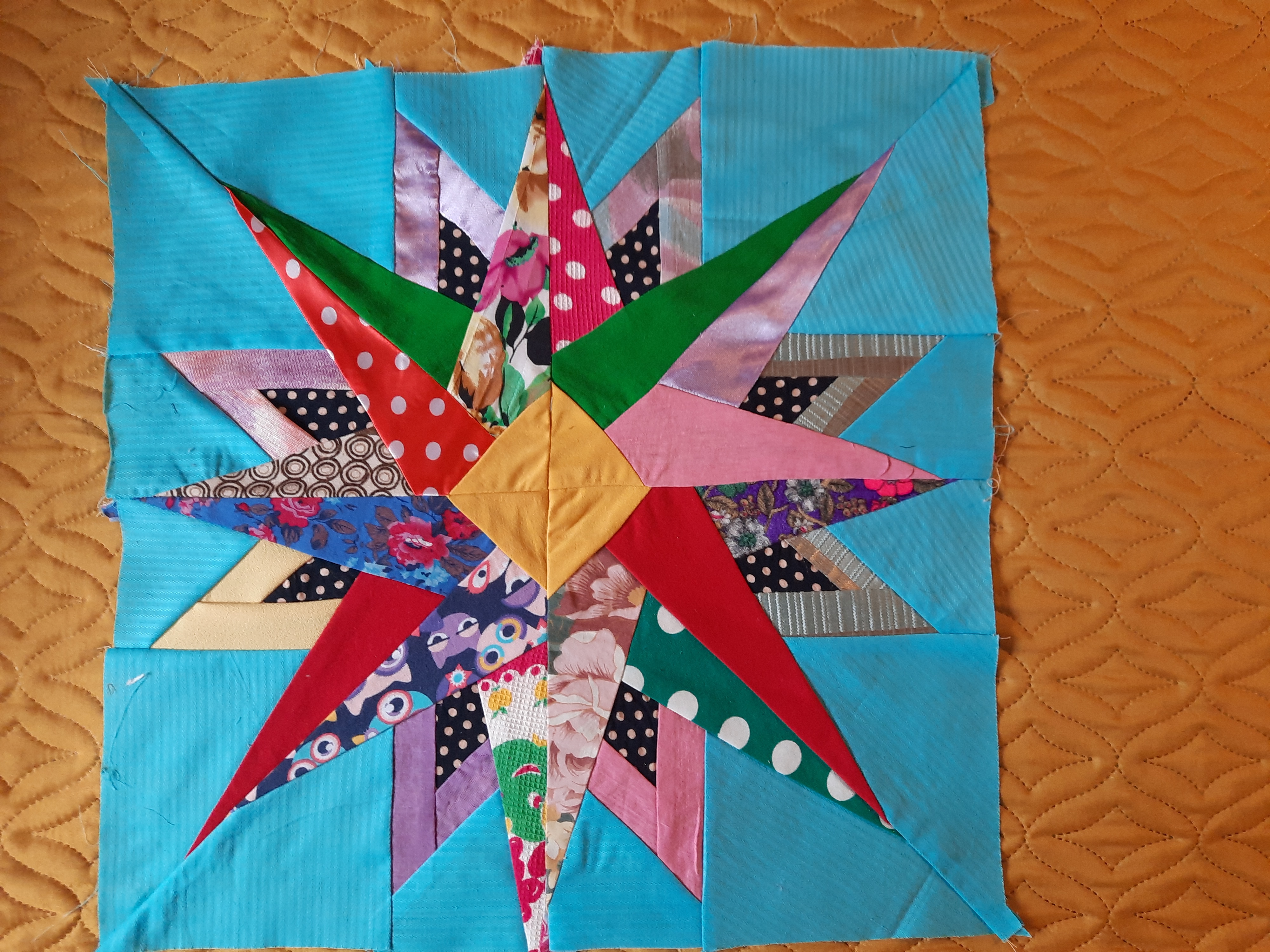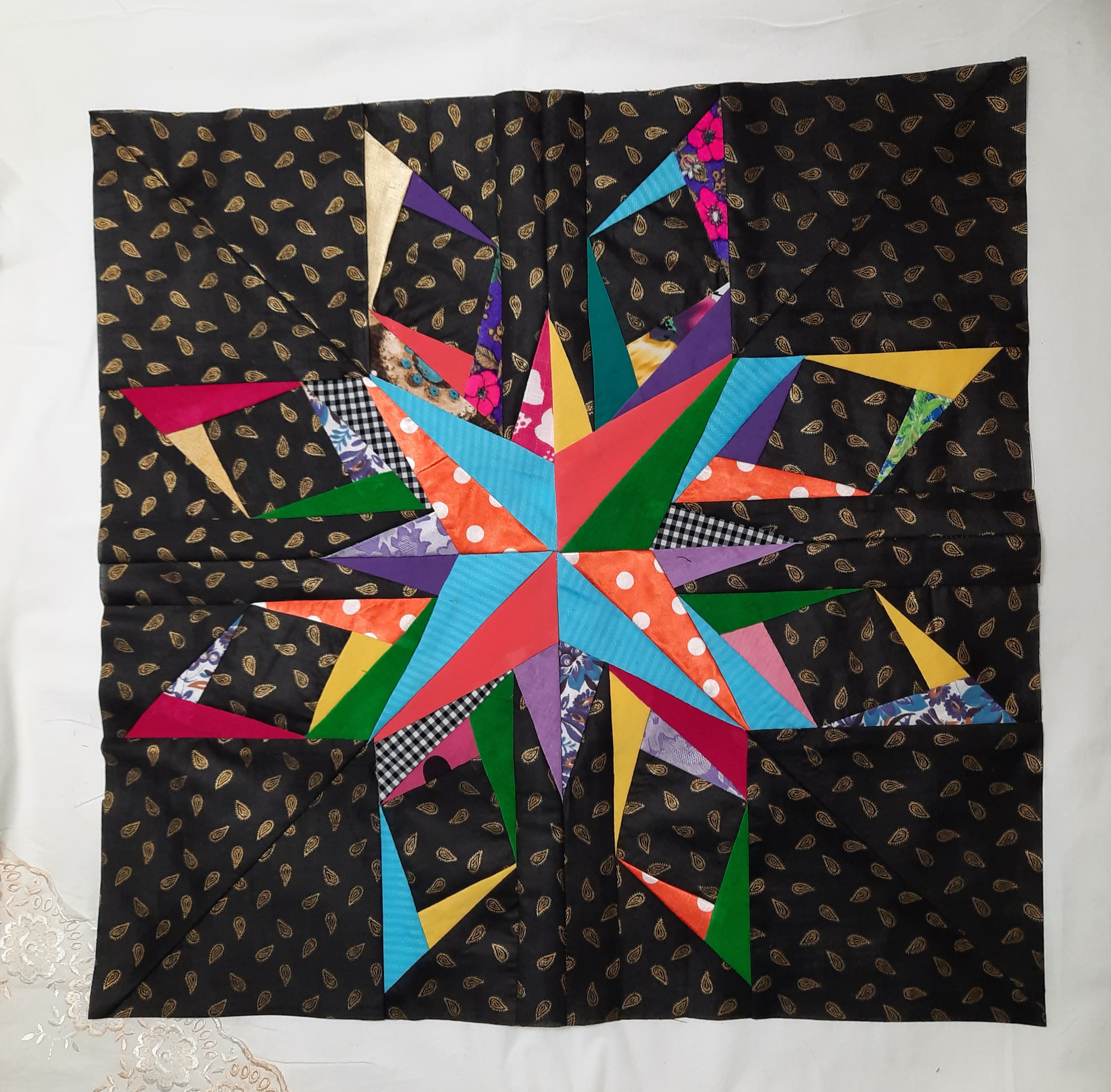 Готовлюсь к пошиву нового одеяла под названием "День и ночь".Такое название возникло из-за черного фона блоков "Космос". Ну и понеслось.Особенно долго шился блок "Радужный цветок"- очень много мелких деталей.Да и собрать 16 углов в центре та ещё задача.Ещё один цветок в стадии пошива.Одеяло обещает быть ярким,как моя подруга,обладательница этого одеяла.Именно ее нарядам мои блоки полнятся яркими тканями